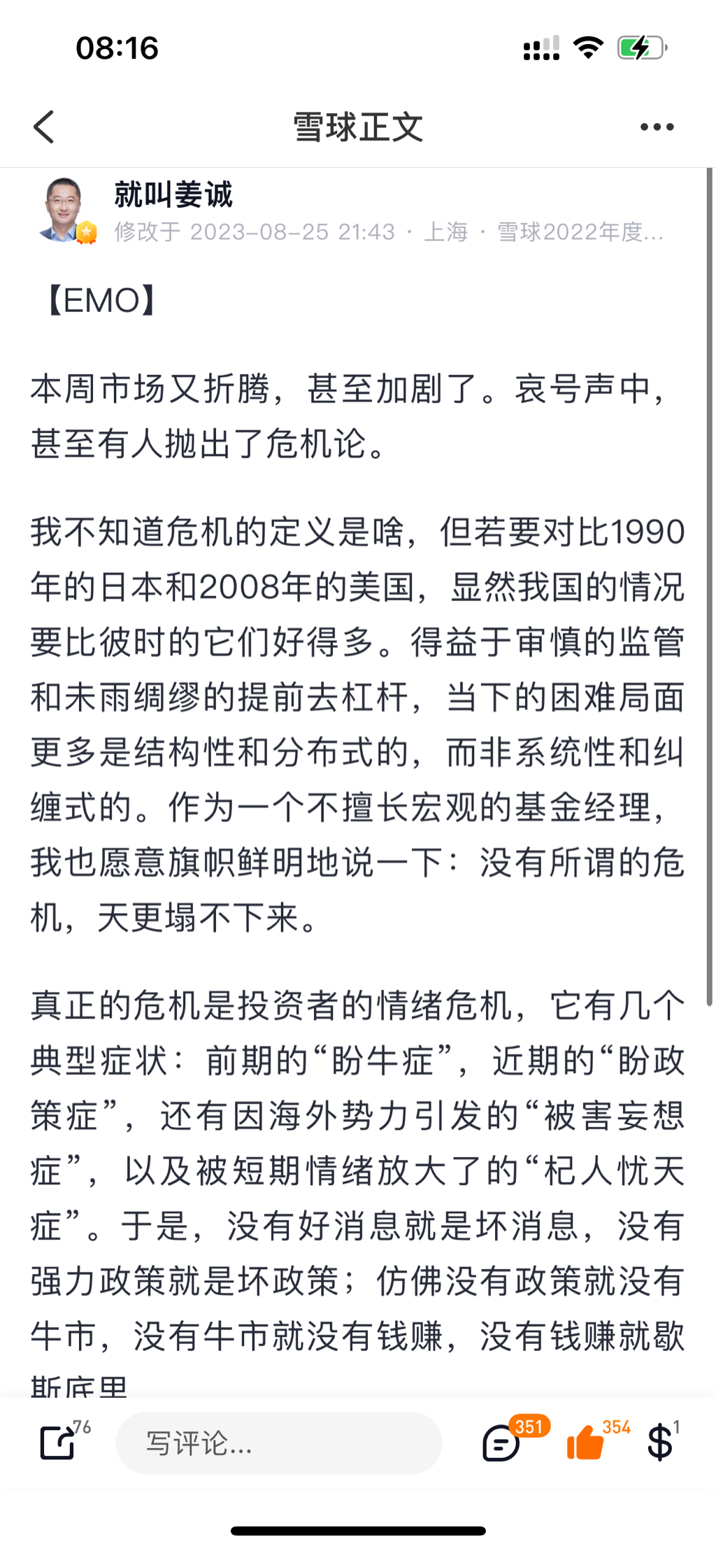 2、即使在现在位置,A股并没有危机,危机感更多是来自于被深套惨重的投资者的一种恐慌情绪的群体共振。这个群体太大了,波及到其他人。就我个人而言,我并没有感觉到危机和恐慌。因此我对目前市场喊的非常凶的救市言论感到有点奇怪,但是可以理解。