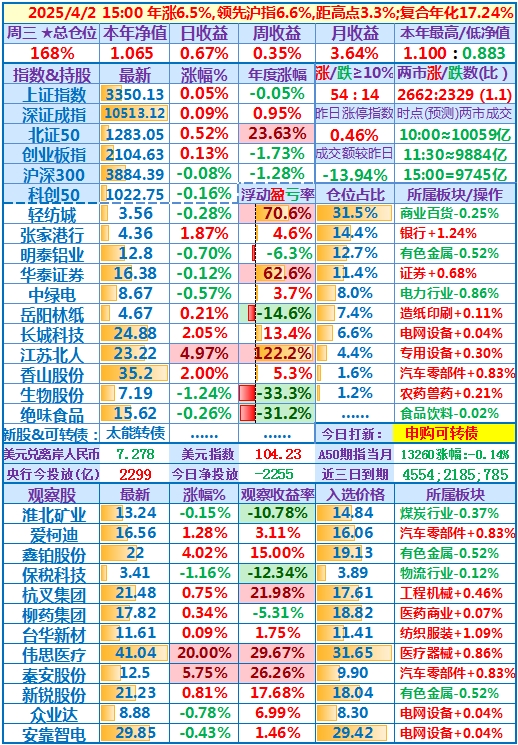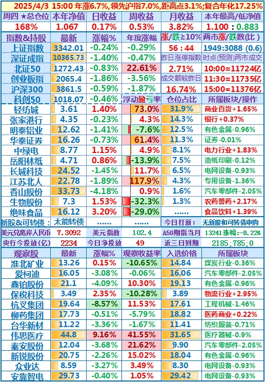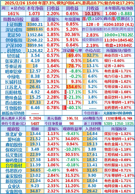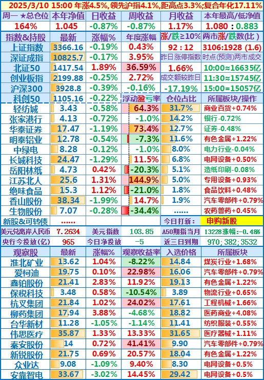 收盘,个股涨跌比4.94,两市成交额1.73万亿。持股10涨3跌,持股涨跌幅不大,持股板块依然有5个涨幅超2%,商业百货板块依旧很强。本周收官,涨幅+3.53%……