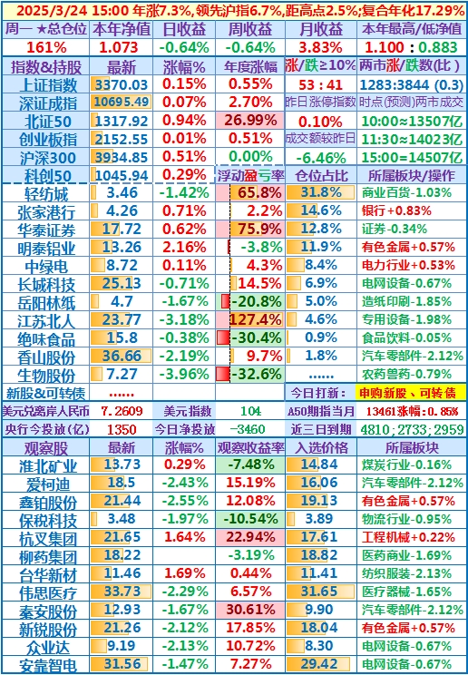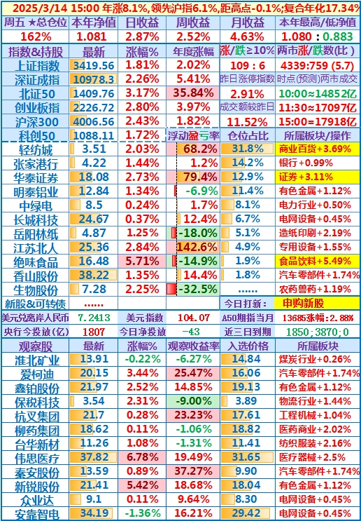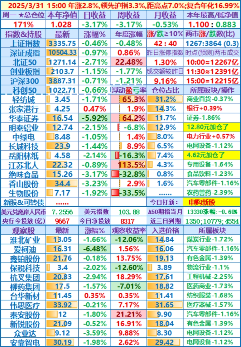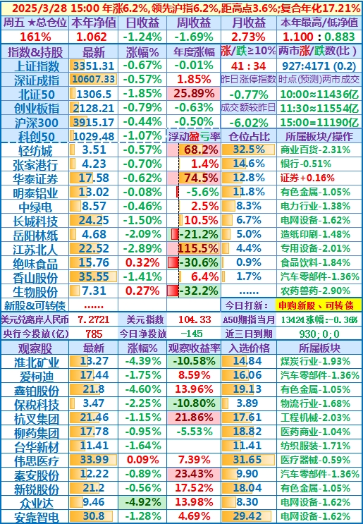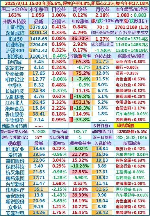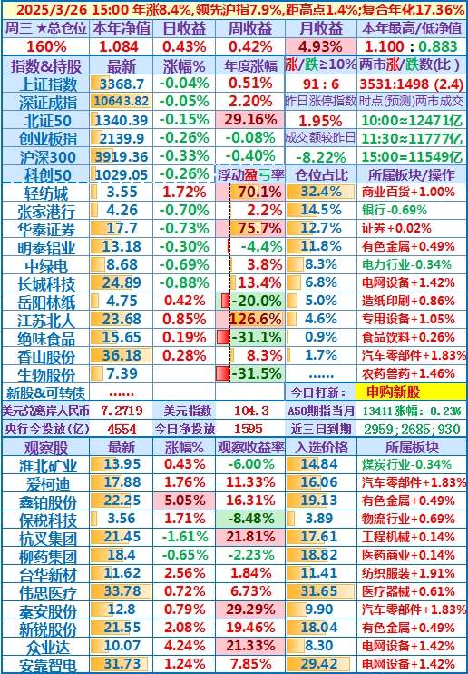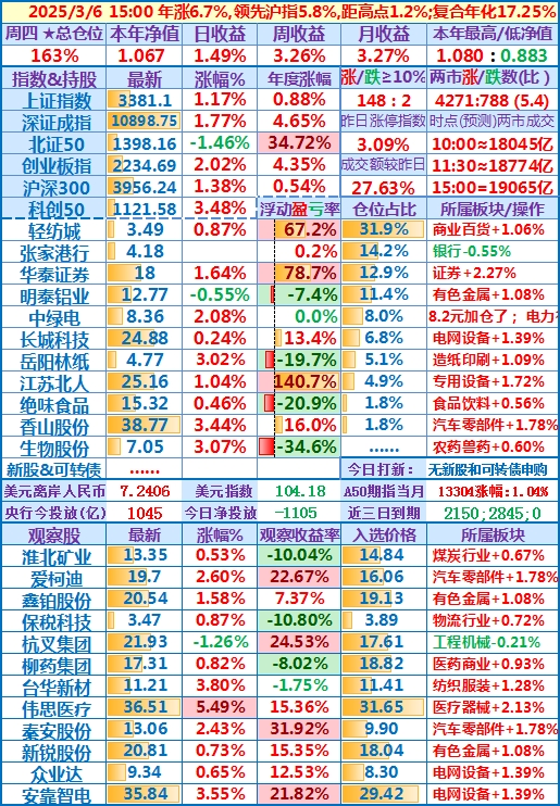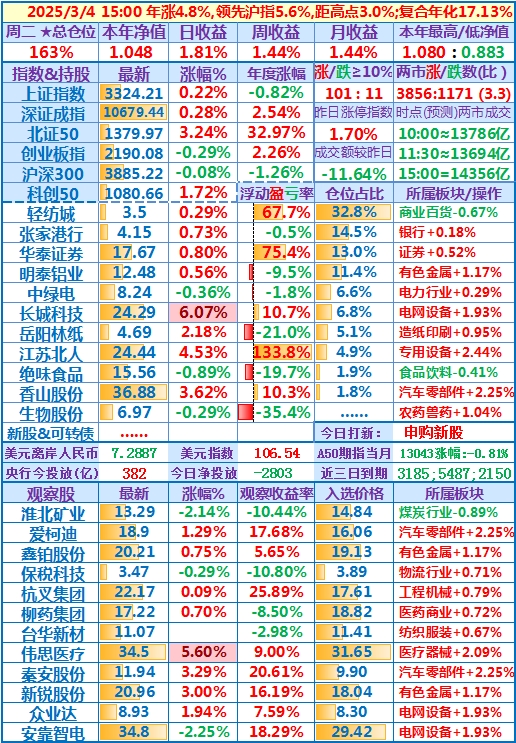 ★★操作(观察):北交所今日有新股申购。继续持股为主,或择机操作避险……开盘5分钟,个股涨跌比0.4,两市成交额量级约2.9万亿。碳市场重磅政策,岳阳林纸受益,高开6.85%(开盘价5.30元),现有所回落。市场有些弱,但看情形,涨跌比正在回升……10时,个股涨跌比1.2,两市成交额量级约2.82万亿。成交额有所减少,但不明显,市场氛围看似不错,个股涨跌多少。重仓股轻纺城较强,账户年收益率刚好突破35%……中午收盘,沪指3888点整数收盘了,个股涨跌比1.7,两市成交额量级约2.7万亿。账户本年收益维持在+35%……收盘,个股涨跌比1.2,两市成交额2.68万亿。持股4涨9跌,轻纺城较强,岳阳林纸今天冲高回落,下跌的股也比较抗跌,今日账户本年净值续创新高……
