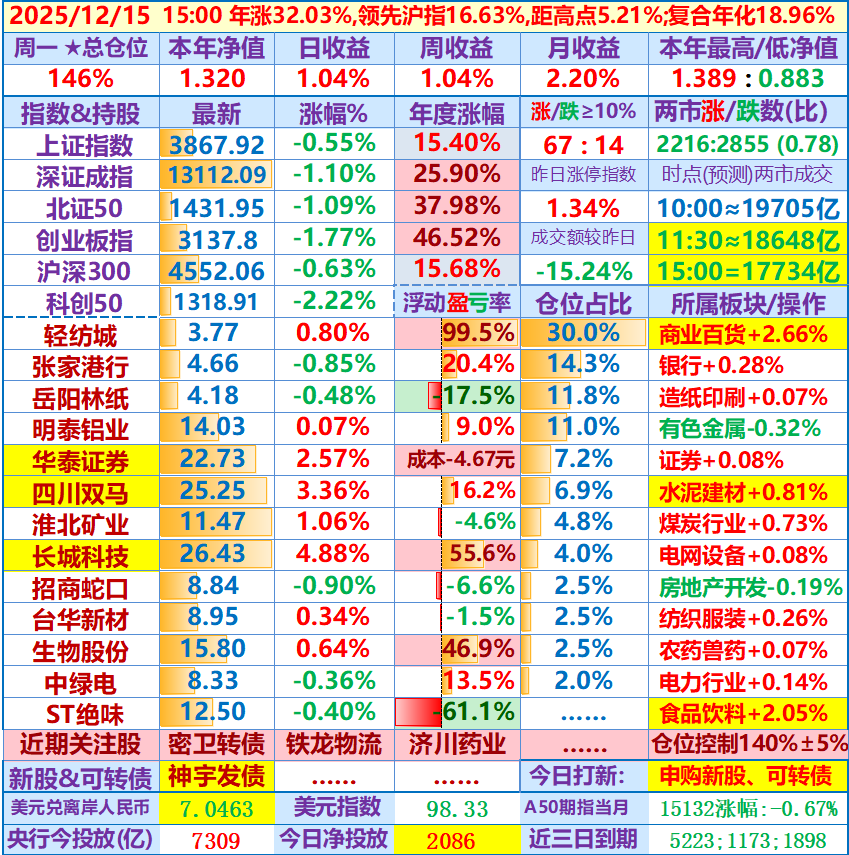 ★★2025-12-15:本年净值1.320,日收益+1.04%,仓位146%……