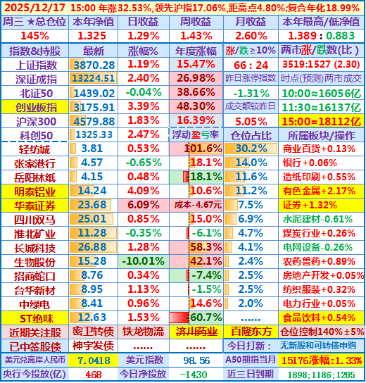 ★★2025-12-17:本年净值1.325,日收益+1.29%,仓位145%……