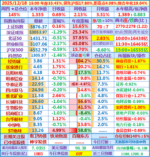 ★★2025-12-18:本年净值1.335,日收益+0.69%,仓位145%……