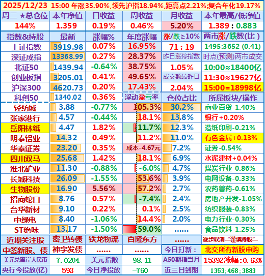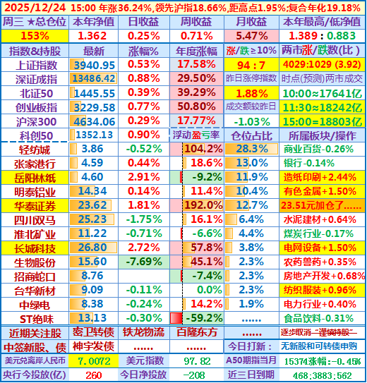收盘,个股涨跌比3.22,两市成交额约2.81万亿。持股12涨1平,涨幅今日涨幅超过2%(最近一次超过+2%已是10月21日的事了),回顾去年11月22日以来加仓三次,差不多补回了11月21日的大减仓的6/7的市值……