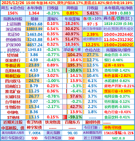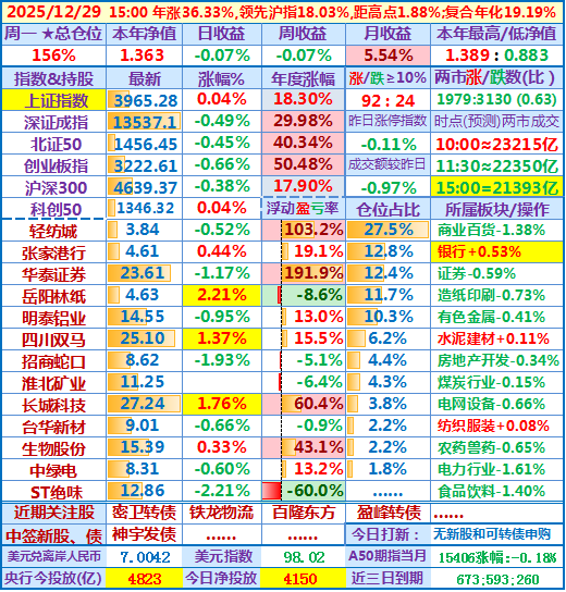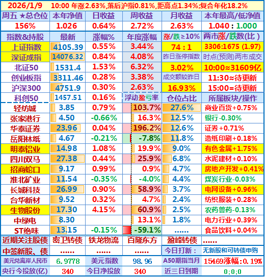 收盘,个股涨跌比2.63,两市成交额1.92万亿。持股7涨1平5跌,且涨跌幅都在±1%区间,账户日收益+0.37%。因加仓招商蛇口,总仓位从153%增至156%……