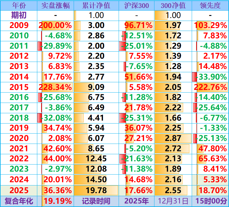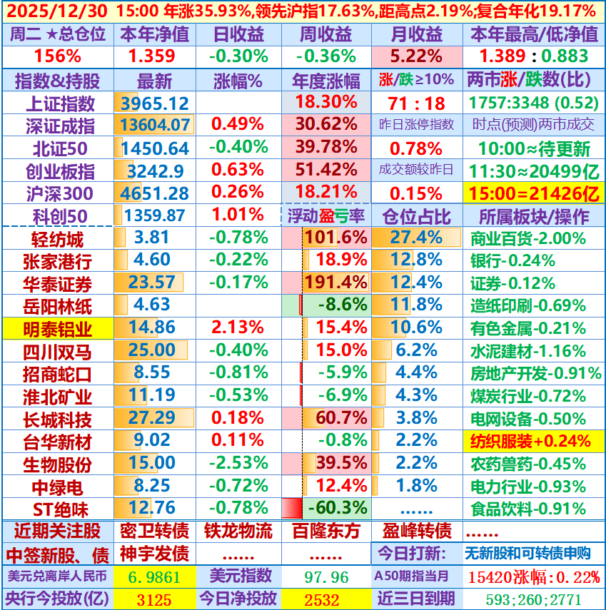 收盘,个股涨跌比0.91,两市成交额2.05万亿。持股6涨1平6跌,台华新材涨幅居前,持股相关行业板块涨的略多。今日账户小涨0.32%。2025年收官,有两三次较大回撤,最终还是较理想完成了投资计划:全年涨幅36.36%(以净值法计算),年内账户净值高点产生于11月13日,净值为1.389,账户累计历史收益处在历史峰值的98.34%高位,账户持股市值处在历史峰值的95.25%高位,关注的四个指标现在都处在对应的55日均线上方。既是年底又是月底,更新复合年化收益率的情况图(见下面第二张图)……
