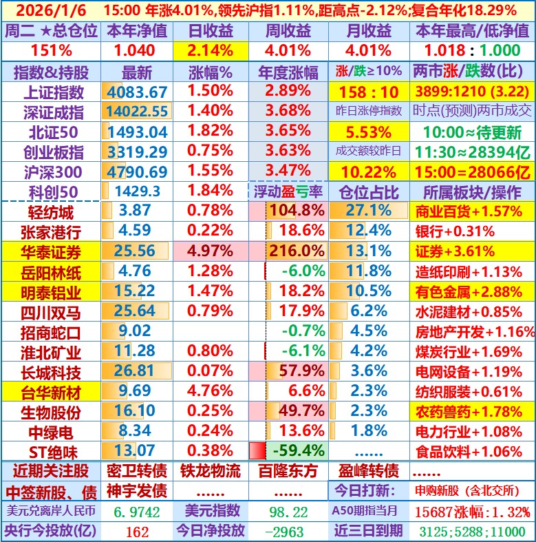 收盘,个股涨跌比4.2,4000多只股票上涨,两市成交额近2.44万亿,比中午预估的多出771亿。持股10涨1平1跌,华泰证券领涨,账户今日涨1%,净值创历史新高……