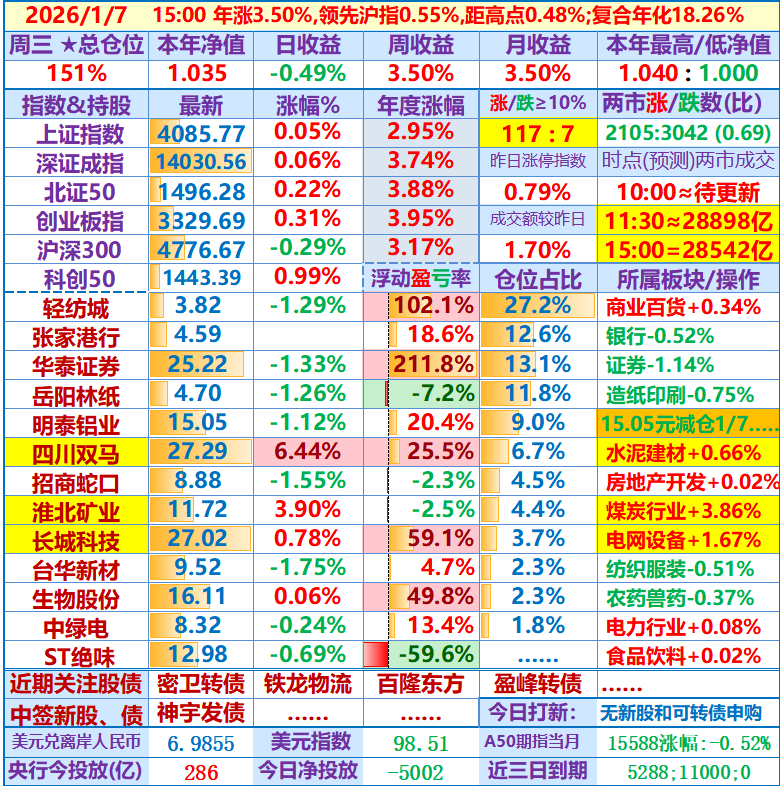 收盘,个股涨跌比0.47(巧了,和昨天一样),两市成交额2.58万亿。账户持股7涨6跌,账户净值今日+0.7%,上午盘中账户净值曾创新高1.352,比本年的每日收盘最高点高出0.001……