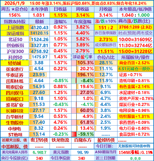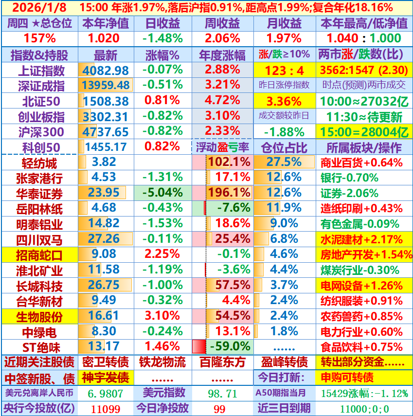 收盘,个股涨跌比2.92,两市成交额约3.12万亿。持股9涨1平3跌,4.51元减仓张家港行一部分,商业百货和有色金属板块涨幅超2%,持股中的生物股份再创近期新高.……