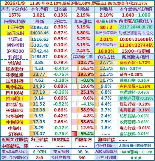 收盘,个股涨跌比4.57,两市成交额2.07万亿。账户持股9涨4跌,账户净值+0.7%(同昨日)……