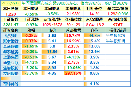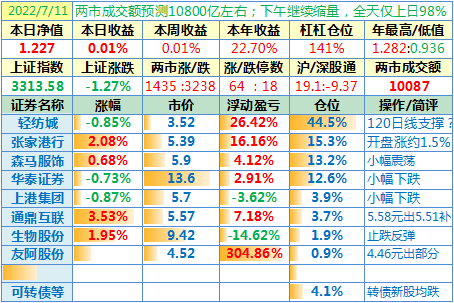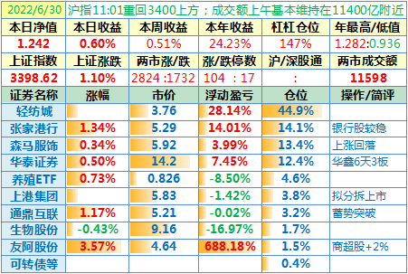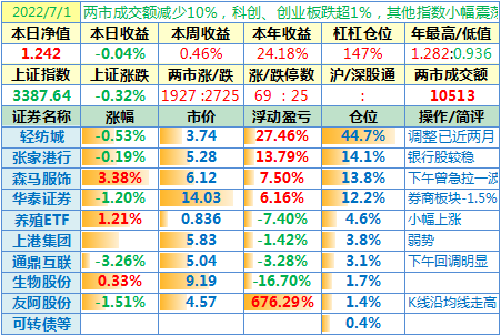 22-07-01:净值 1.242,日收益-0.04%,周收益+0.46%,7月份收益-0.04%,2022年收益+24.18%。两市涨跌比7:10,涨停家数减少,跌停家数有所增加。港股市场今日因“香港特别行政区成立纪念日”休市,沪深港通今日南北向休市。两市合计成交10513亿元,为上一交易日的90.6%……