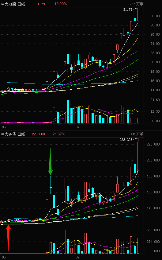 今天的通用设备板块涨幅排行业板块第八,我想起了6月2日进、6月22日出的中大转债,今天正股和转债也是双双涨停的,而且价格相对那时已经高得吓人了