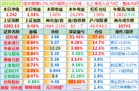 观察:两市涨跌比307:100,赚钱效应好;收盘成交8341亿,为昨日96.7%,已连续三日处于55日均线下方。沪指探底3246后回升,考验55日均线3244.4点支撑,暂时成功,稍微松了一口气,仓位总体保持不变。北上资金净流入超70亿。房地产板块发力。继续谨慎关注市场变化……