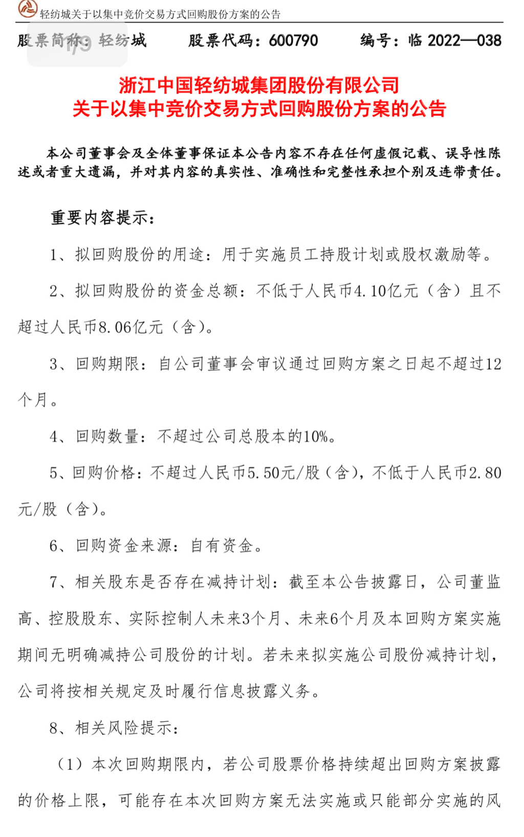 - 轻纺城(600790)7月12日晚间公告,预计2022年半年度实现归属于母公司所有者的净利润为3亿元到4亿元,同比增加38.91%到85.21%。报告期内,全资子公司绍兴中国轻纺城国际物流中心有限公司收到第一笔房屋征迁补偿款,该部分收益计入资产处置收益。