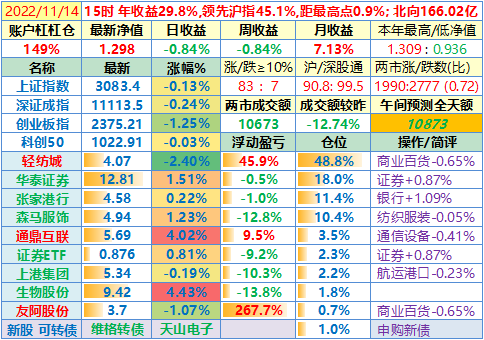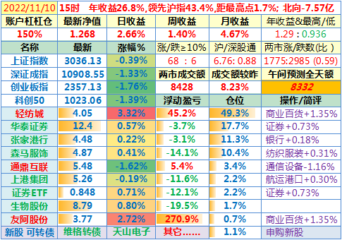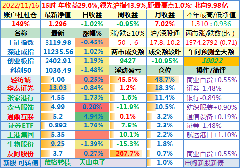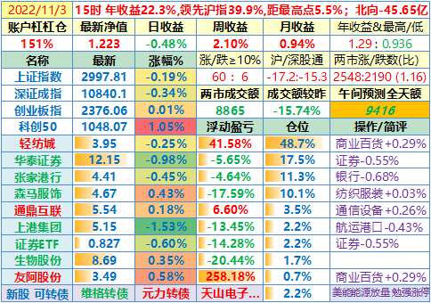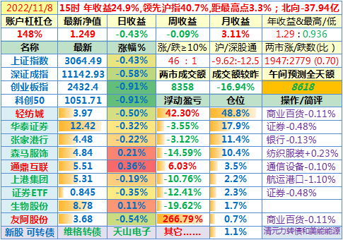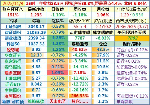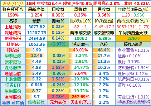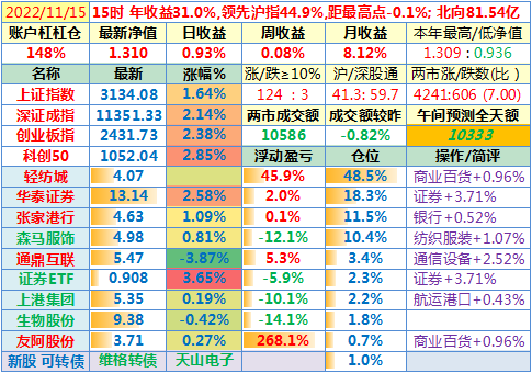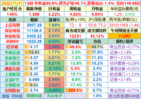 2022-11-11:【账户净值1.309,创新高!两市成交额放大45%至12231亿!李大霄说小牛市。昨晚美国公布10月CPI同比上涨7.7%,全球股指一片涨!这个双十一比较有意思】
