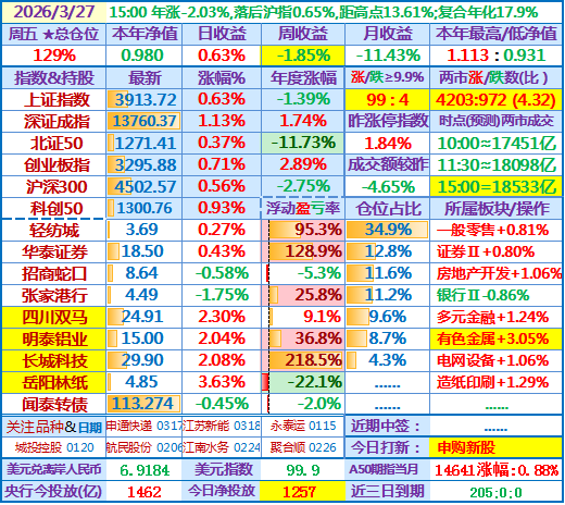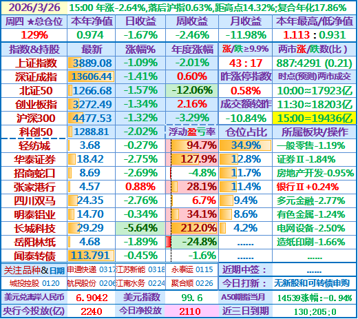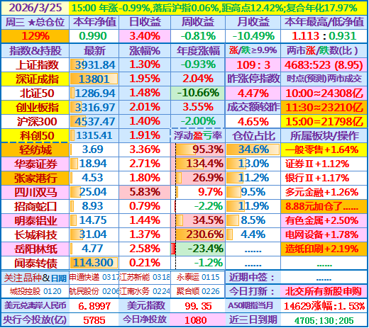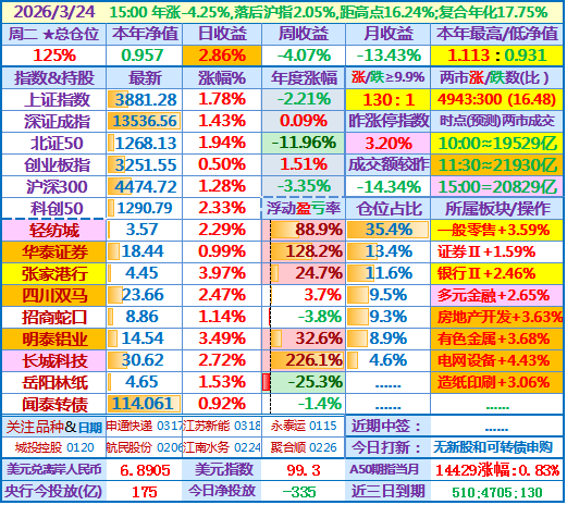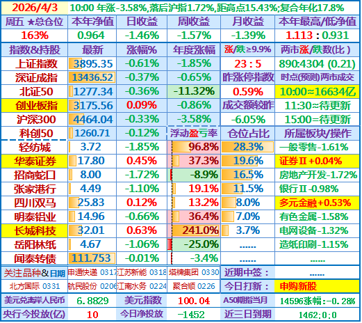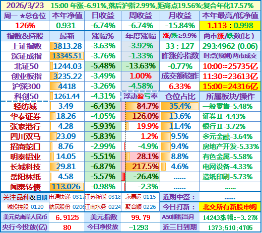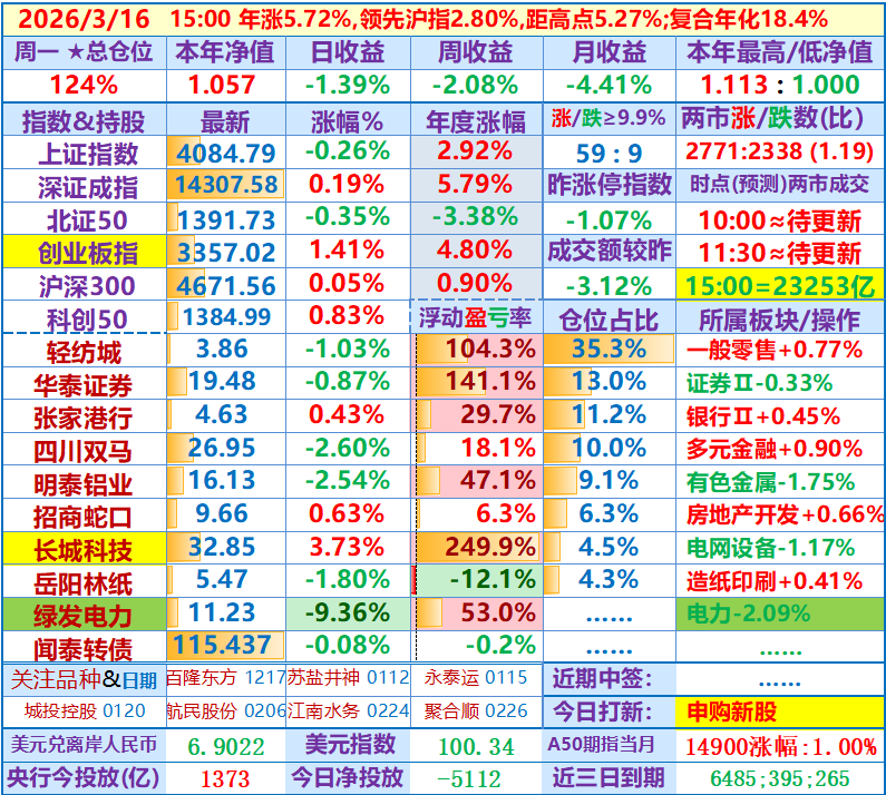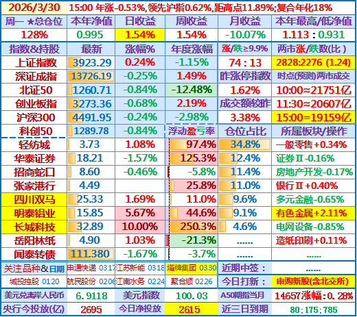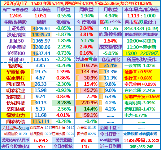 ★★2026-03-18:本年净值1.046,日收益-0.50%。仓位128%(比昨天高了约4%)……楼主挺厉害,还是正收益,我已经深深潜入水底了。有个问题请教楼主,我看第一大和第二大重仓股今年以来都是跌的,而且华泰证券跌幅还不小,楼主今年主要是通过什么获取了正收益