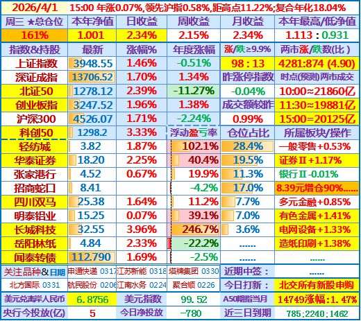 ★★操作(观察):谨慎持股,近期仓位先保持在140%±5%……北交所有新股申购……