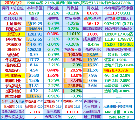 收盘,个股涨跌比0.17,两市成交额1.86万亿。持股2涨11跌,今张家港行、生物股份上涨,收盘日收益-1.45%。观察的主要指数有一定幅度的下跌,除了奇怪的北证50上涨了3.84%……