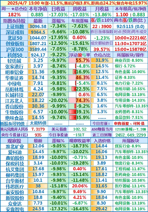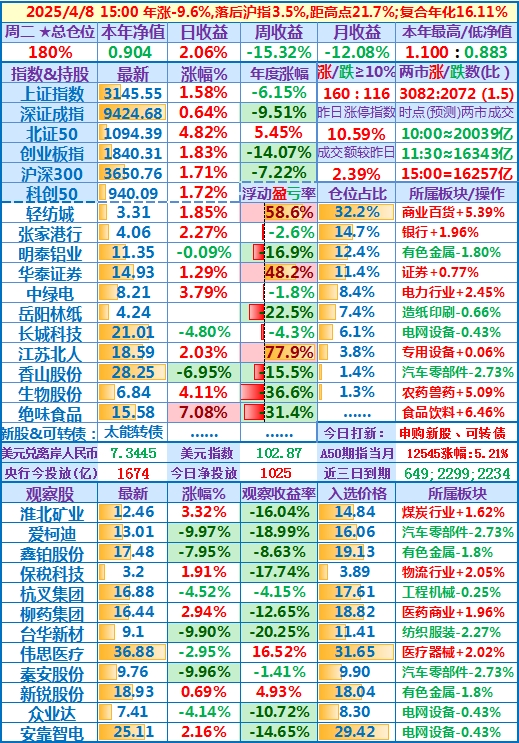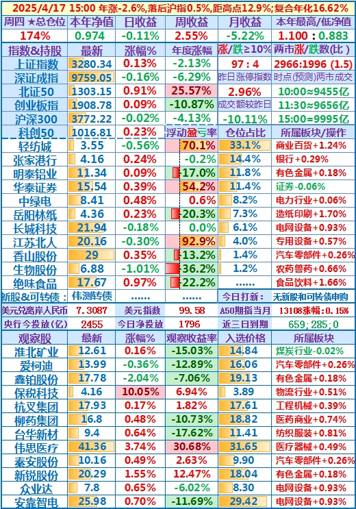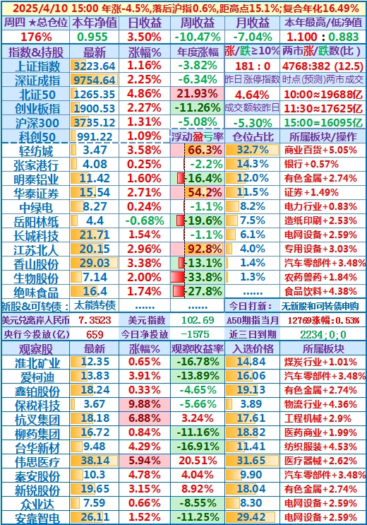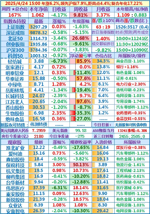 2025-04-24:本年净值1.062,日收益-4.17%,周收益+9.81%,月收益+3.37%,年收益+6.25%。仓位167%……