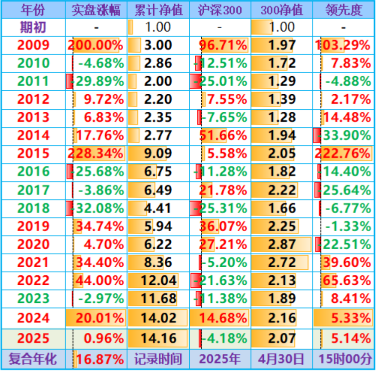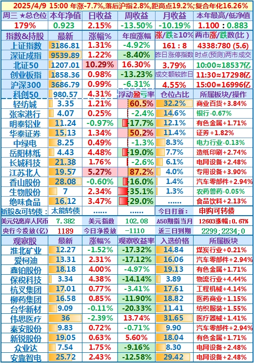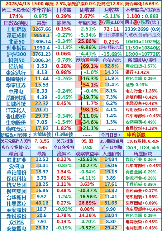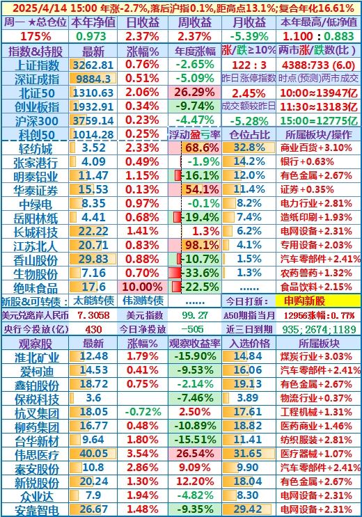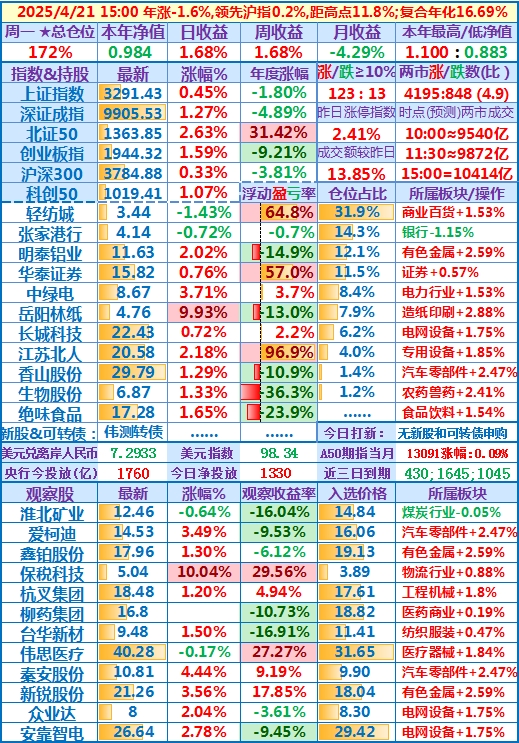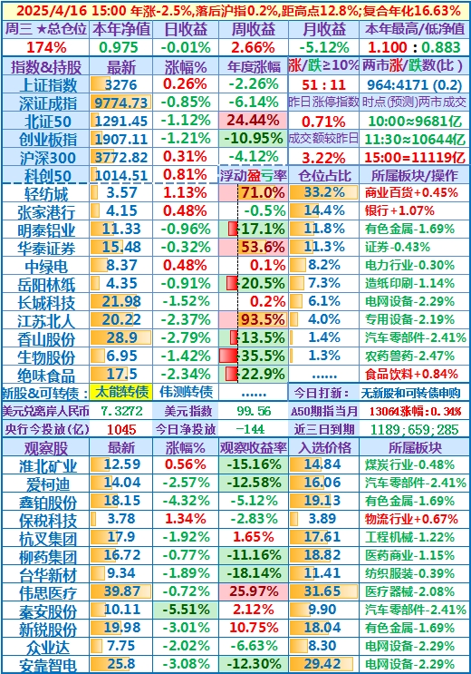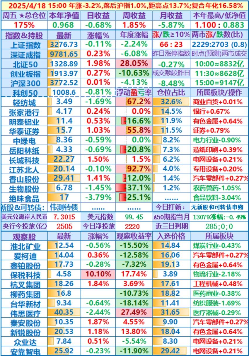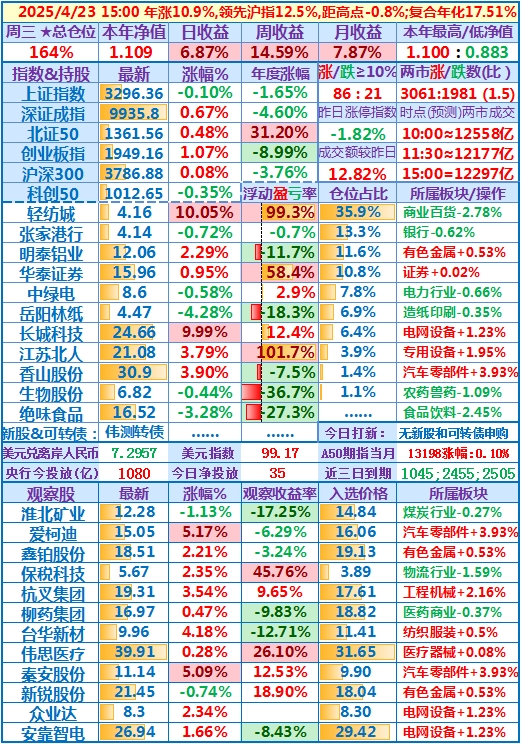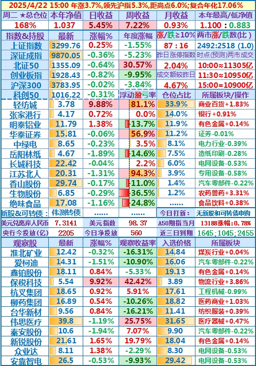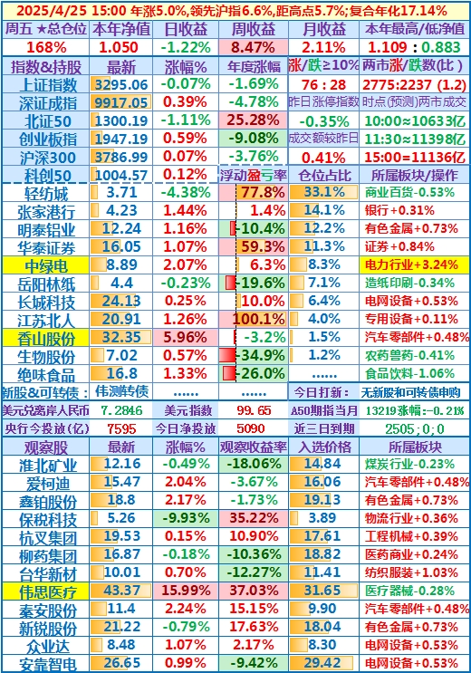 2025-04-25:本年净值1.050,日收益-1.22%,周收益+8.47%,月收益+2.11%,年收益+4.95%。仓位168%……