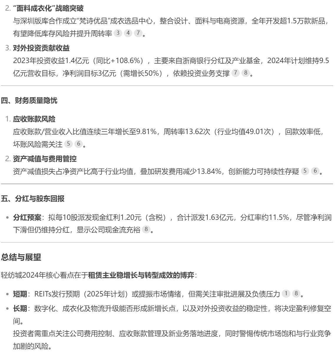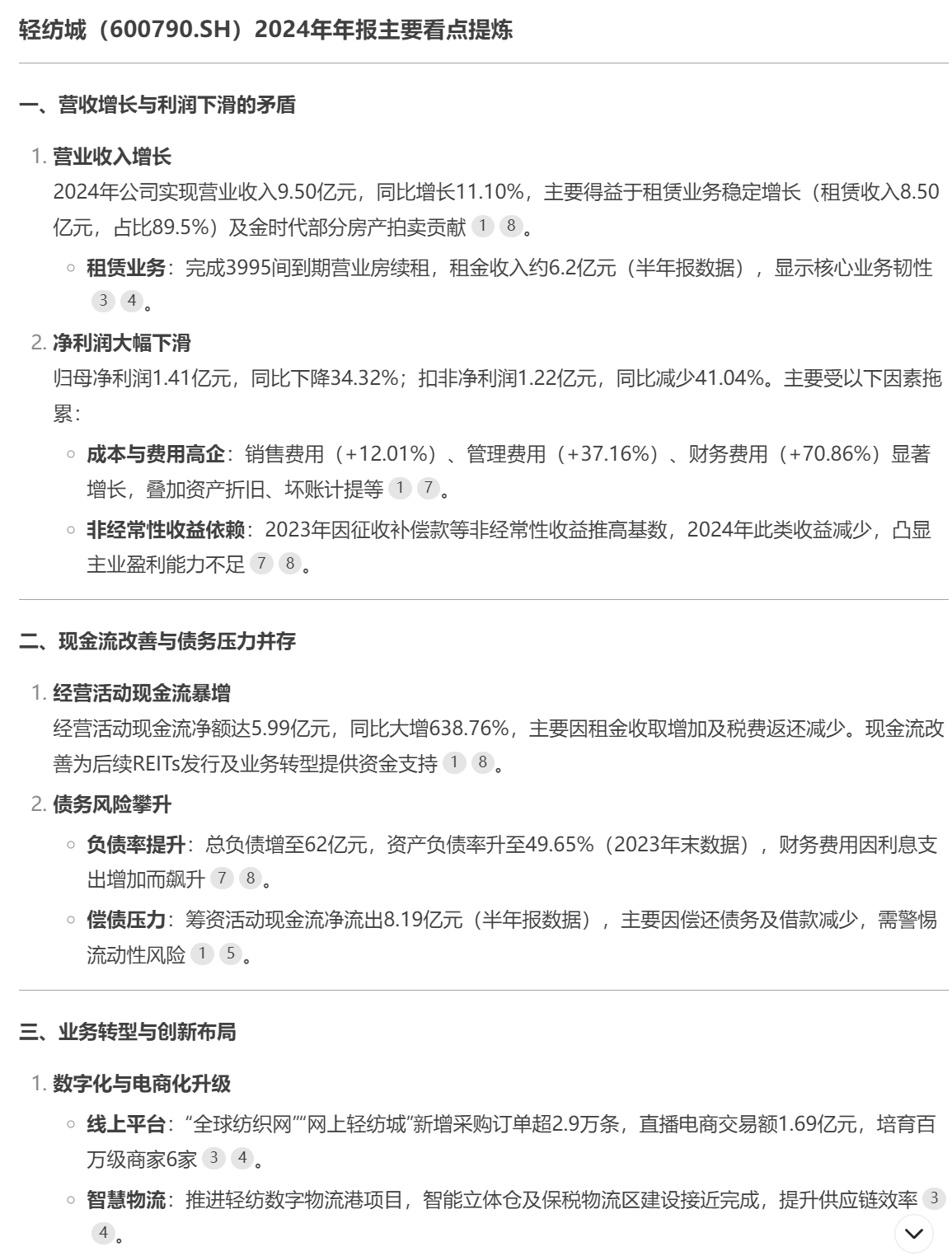 重仓股轻纺城2024年年报已发布,我让DeepSeek从年报中提炼该股的主要看点: