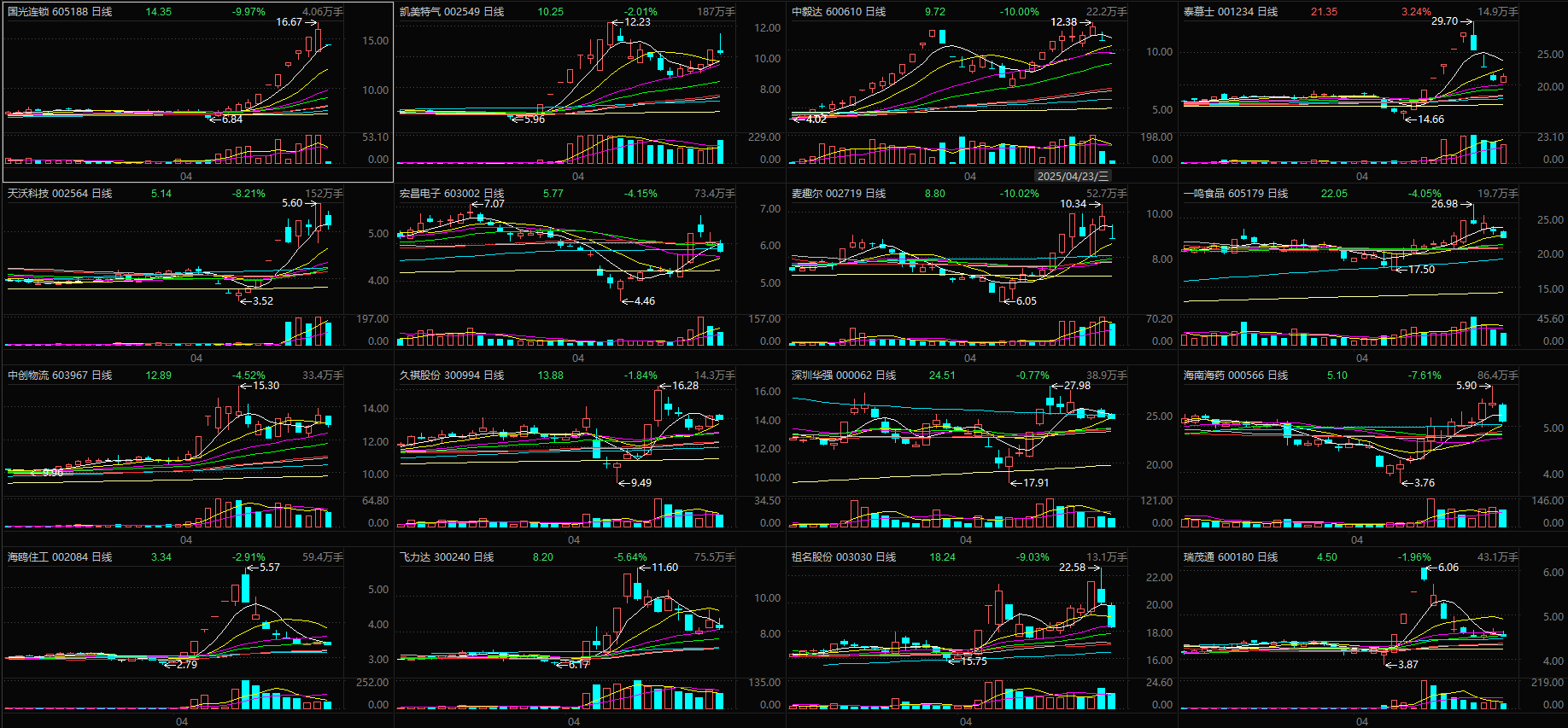 图二:东莞证券股份有限公司南京分公司近期出现曾出现在龙虎榜的个股的K线多股组合(部分)