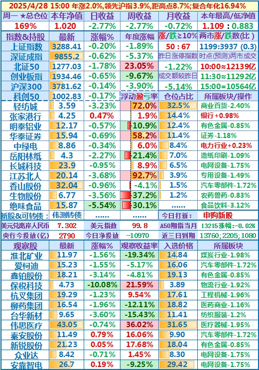 2025-04-28:本年净值1.020,日、周收益-2.77%,月收益-0.72%(由正转负),年收益+2.05%。仓位169%……