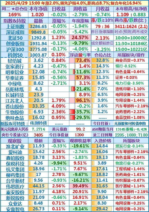 2025-04-29:本年净值1.020,日收益-0.02%,周收益-2.79%,月收益-0.74%,年收益+2.03%。仓位169%……