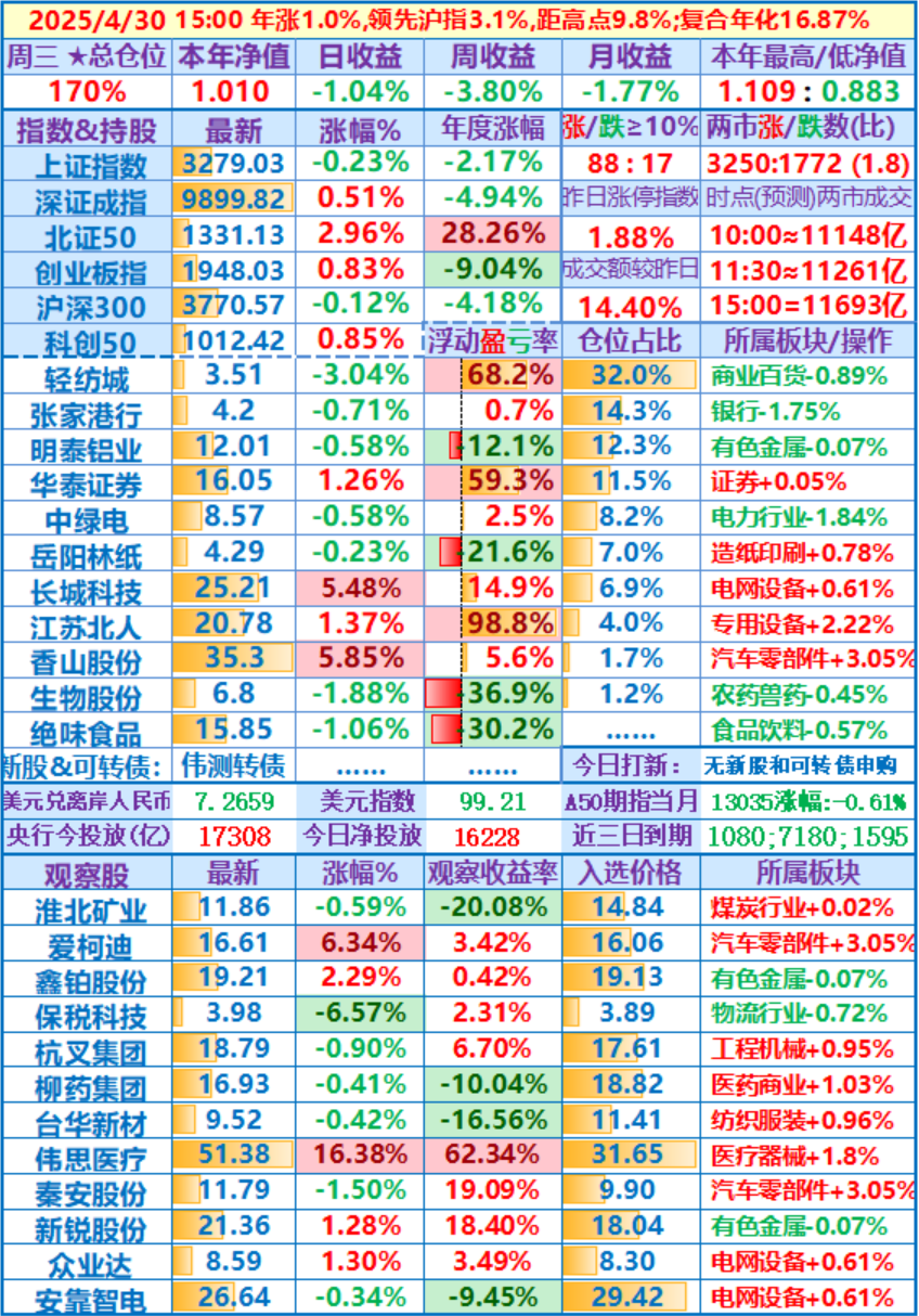 2025-04-30:本年净值1.010,日收益-1.04%,周收益-3.80%,月收益-1.77%,年收益+0.96%。仓位170%……
