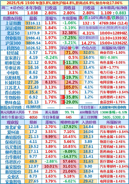 2025-05-06:本年净值1.038,日、周、月收益+2.80%,年收益+3.79%。仓位168%……