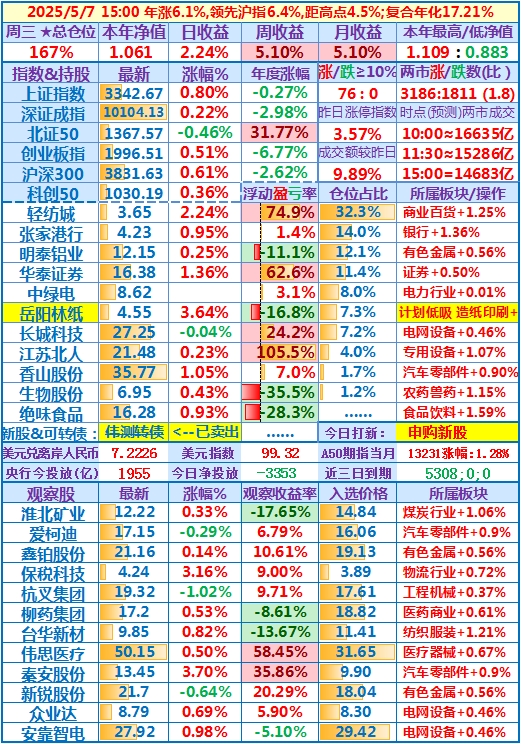 2025-05-07:本年净值1.061,日收益+2.24%,周、月收益+5.10%,年收益+6.12%。仓位167%……