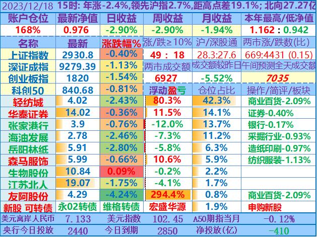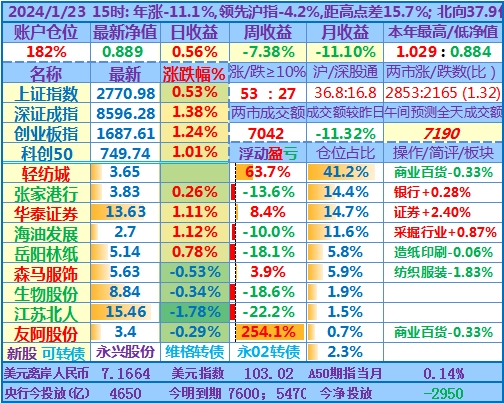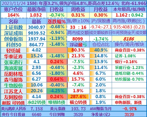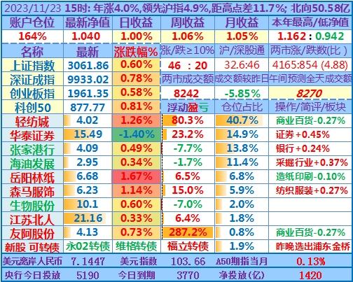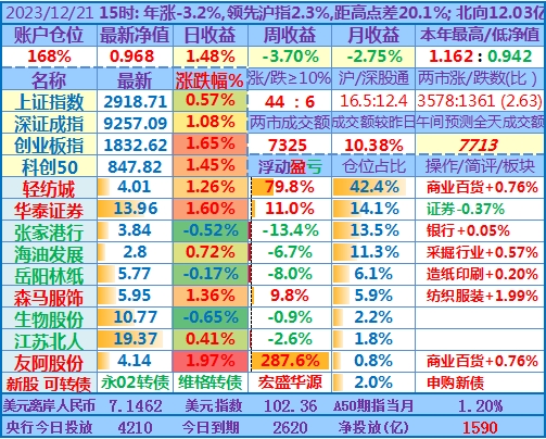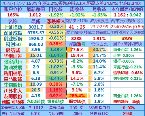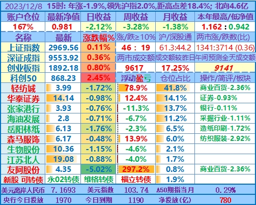 ★★操作:申购新股;持仓股中四只个股涨幅超2%,商业百货涨1.94%,第一重仓股轻纺城+2.01%,盘中有多次几千手买单的异动;账户净值回到1.00上方;我给自己的操作参考仍是:沪指2923点是市场底……