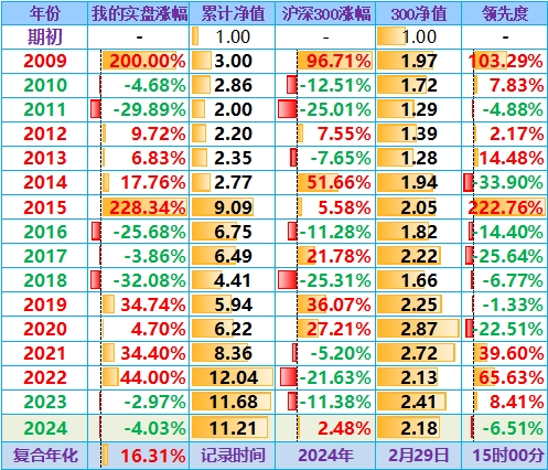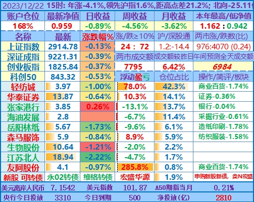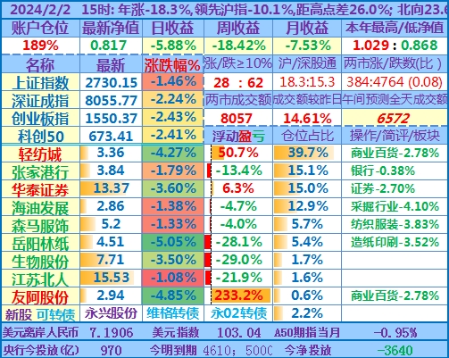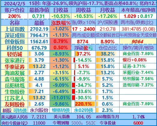 ★★今天是兔年A股的最后一个交易日,兔年交易日内,沪指-12.22%,本人账户-13.03%(以净资产为基数的每份净值),跑输0.81%。节后2月19日开市,祝所有人享受春节假期,龙年好运!
