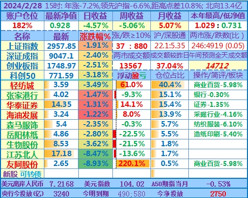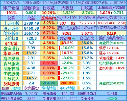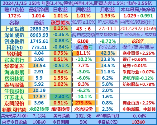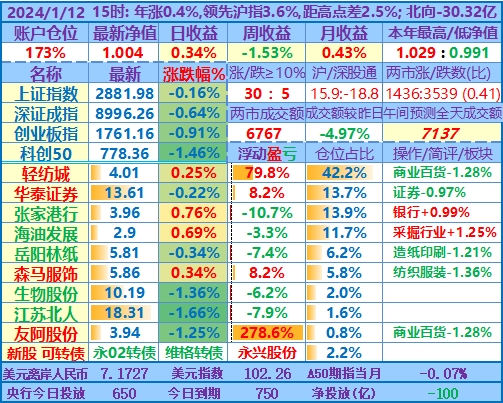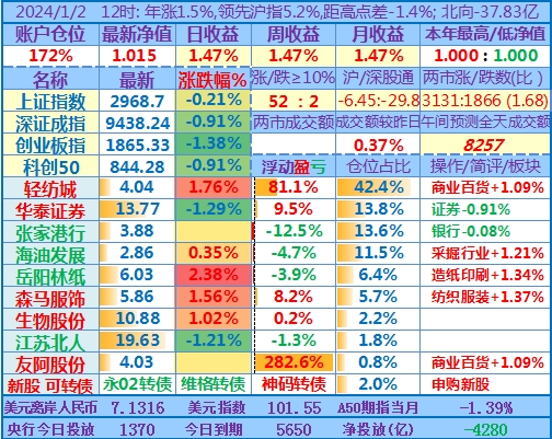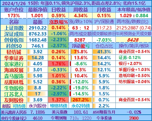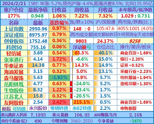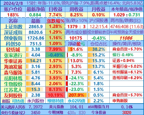★★操作:无……龙年开市次日,账户依旧飘红,重仓股轻纺城反弹有力,华泰证券下午略有走强,也许和T+0的讨论声又起有关……周末有用款需求,故预计近两日减仓准备取款;近期我选股过程中对微小盘有意回避,理由:怕监管加强、倒查IPO违规时一些小票更容易受影响,故未增加这类股入观察池……