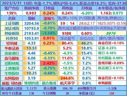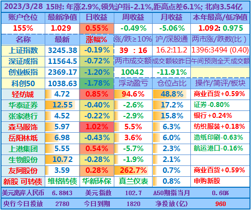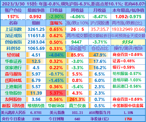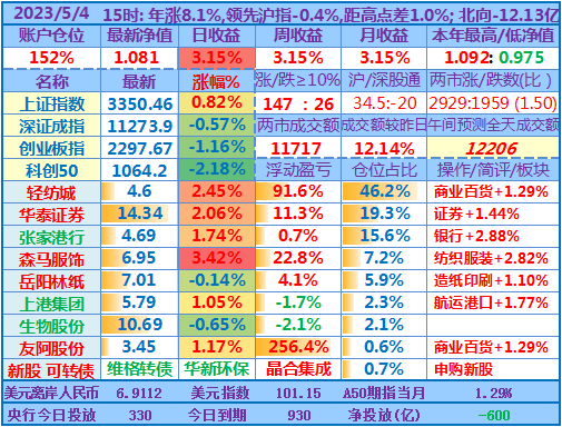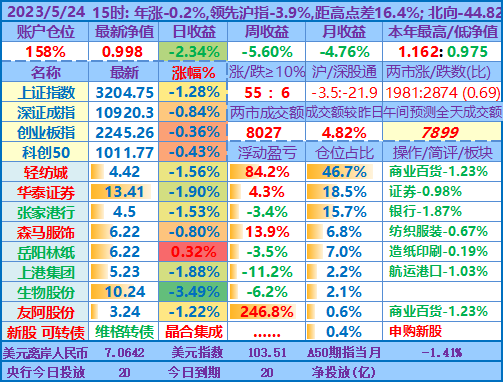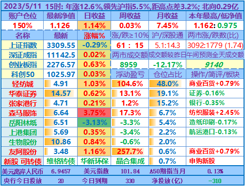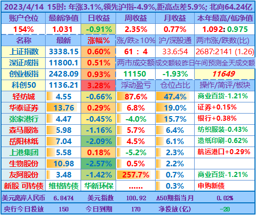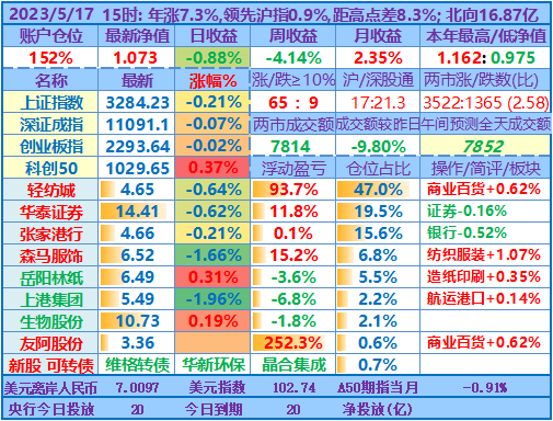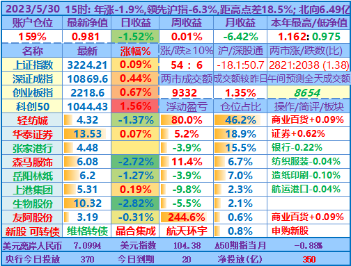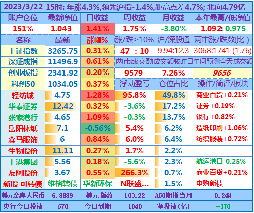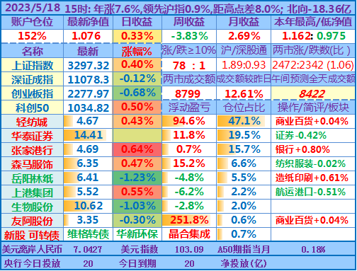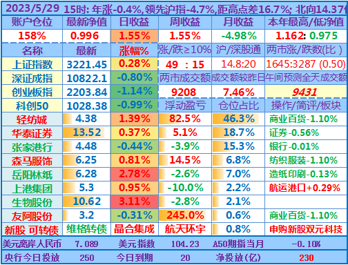 ★★操作:申购新股、新债;点评:银行股高歌猛进、券商也涨幅较大,重仓股轻纺城也再创近期新高5.04元,账户前三持仓股加上1.48倍杠杆带来的日收益率超过沪指的涨幅,其他投资品总仓位不到18%,涨跌不一,尤其是持有的两只中签新股尚处于亏损中……