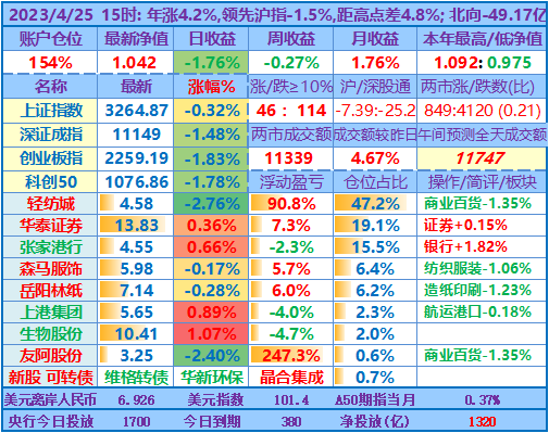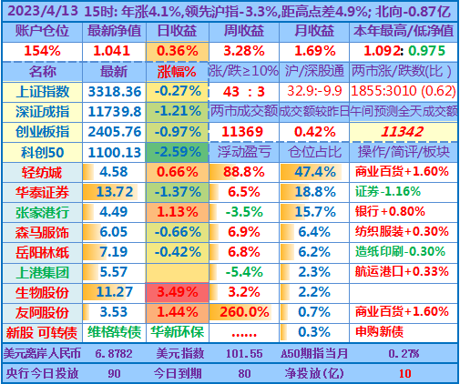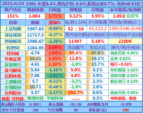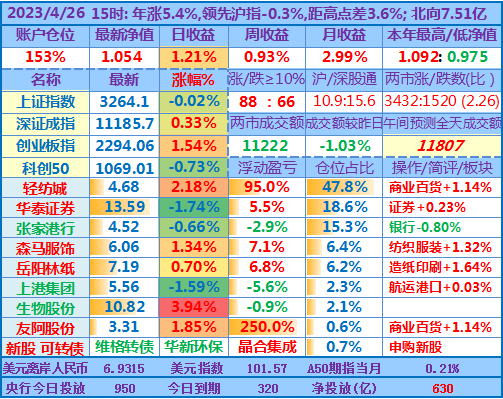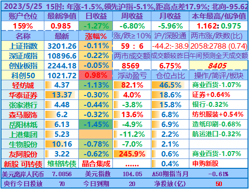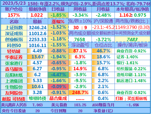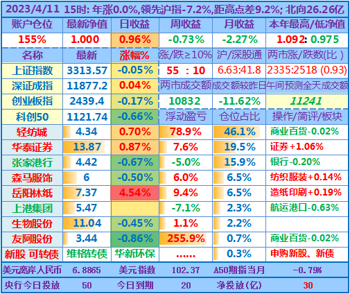 ★★操作:申购新股;今天继续取现,然后融资买入岳阳林纸,目前仓位157%,无聊的行情让人有些发困,最近个把月也是越来越多人降低了操盘记录更新的频率。但时间周期拉长看,感觉自己持仓股的下跌会为未来的上涨预留更多空间(或只是自我安慰)。从年收益角度看,也许再跌个两天,看盘的状态会接近去年3、4月大盘低迷时的状态了,但愿奇迹日早点出现……