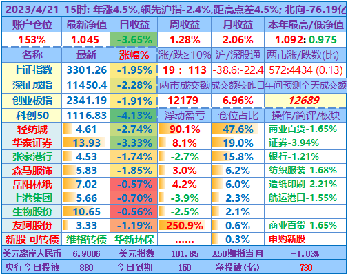 ★★两市成交12179亿元>55日均线(9697亿元),日变化+6.96% 。沪指3301.26点>55日均线(3285点),跌1.95%,深证成指跌2.28%,创业板指跌1.91%。半导体、互联网、软件板块跌幅居前,船舶制造板块逆市大涨,其它上涨的行业板块仅有航天航空、中药。两市不到600支个股上涨,涨跌比0.13;北向净流出相较近期有点大;跌停板(或跌幅大于10%)数量超过110只,为近期少见;继续关注沪指未来的量能变化,感觉成交额应该能维持在55日均线上方,沪指倒有点不好说,我将继续持股为主……