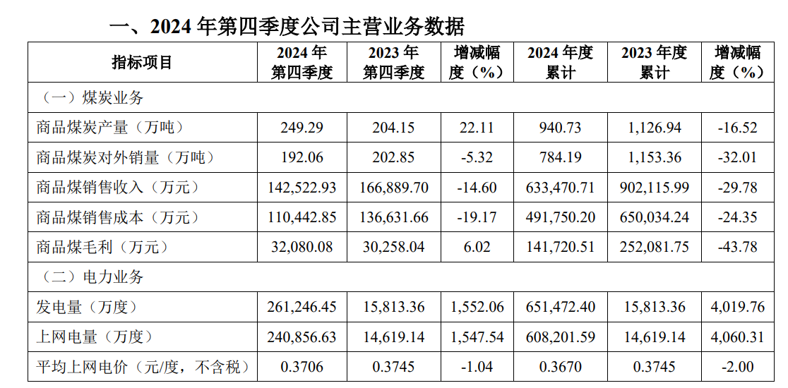 24年全年,煤炭产量减16%,销量降近1/3。公司24年亏损主要与此相关。全年煤炭产销差额156万吨,若全是混煤,大概是两个新建电厂1个季度的用量。考虑到两电厂机组年内陆续投产的节奏(年初新光1号,年中新光2号,年末普定1号),全年投入商业运营三个机组折合一个半,也即1.5x66万KW=100万千瓦。度电煤耗300g,年化利用小时4000,全年需耗标准煤120万吨,公司混煤热值大约3500大卡,折合半吨标煤,也即电厂需要240万吨自产混煤,公司156万的产销差额貌似还不够?煤炭完全自用后,煤炭业绩贡献主要靠精煤。看精煤能否在Q1卖个好价格吧。