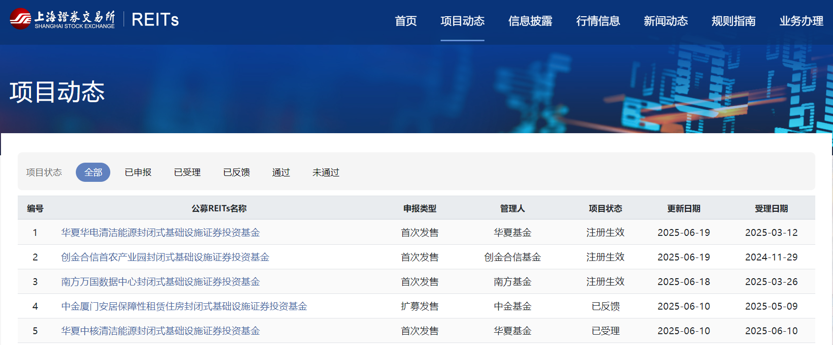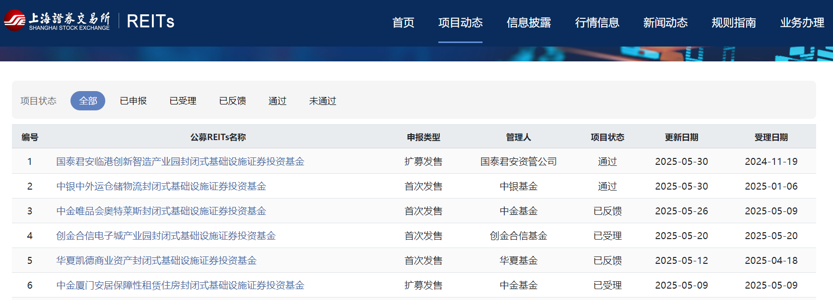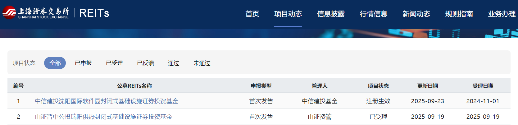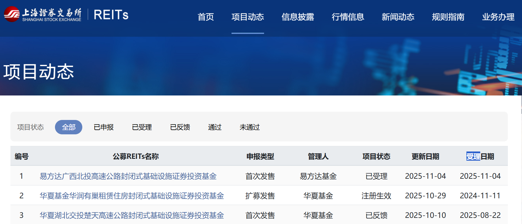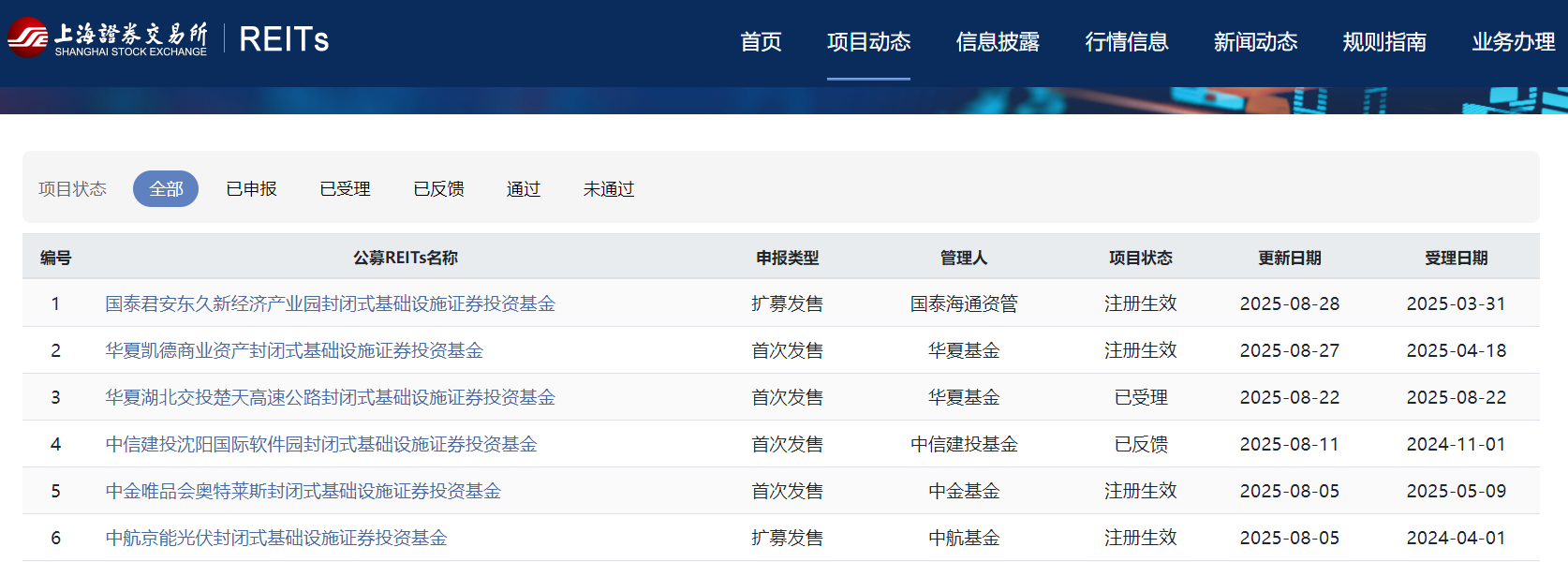 上海证券交易所有10个公募REITs:7个已上市交易、1个已受理,2个已反馈。