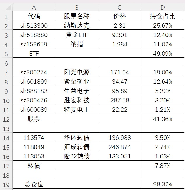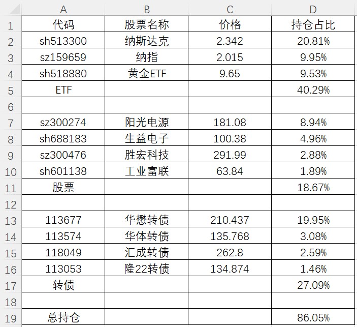 持仓又是大跌,周三在几乎最低点160.97清了大部分阳光电源,如果不减仓,本周应该是-4.9%,-3%的超额,好歹后来在纳指ETF和转债挽回点损失,否则负超额更多。