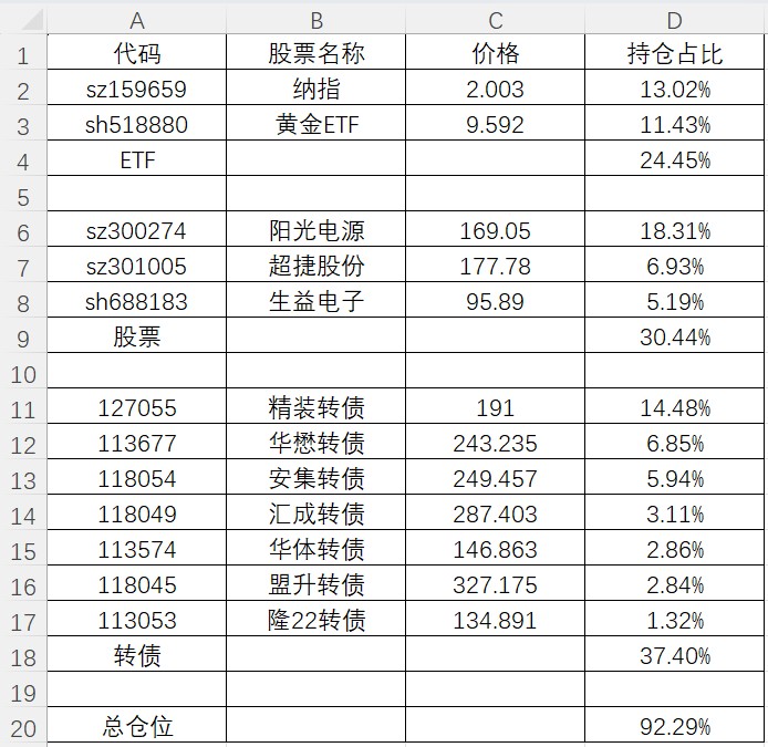 年度净值1.0384,仓位92.65%,QDII场内基金22.98%,股票19.71%,转债饼43.77%,红利ETF6.19%。