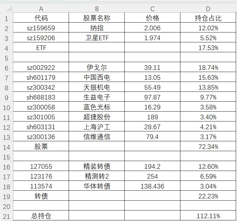 差距主要在周五上午大跌时产生,看着账户不断缩水,恐慌中割肉清仓了华体转债,之后213左右清仓了绿的谐波,几乎就是清在大涨前,之后减仓了杰瑞股份和深科技,收盘前感觉转债都在杀溢价,怕下周还会持续,又减了一多半的精达。