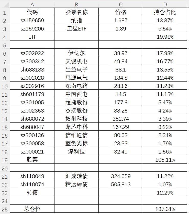 超额0.7%,主要是300左右止盈江波龙,0.91附近止盈电池ETF产生。再就是周一开盘21.43冲了宏源药业,周二21.65止盈,错过后面的大涨大跌。还有就是154.5冲了天赐转债,一个账户在162附近清仓,腾出的资金136.5买了隆22,另一个账户网格至今。