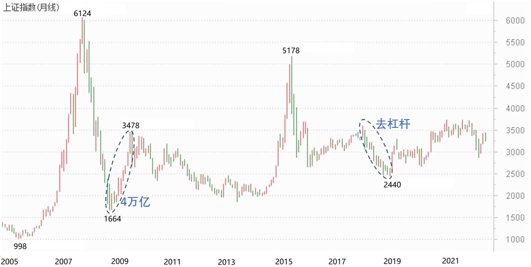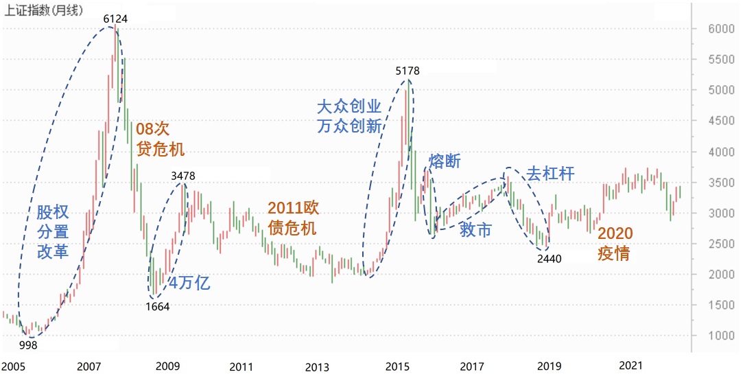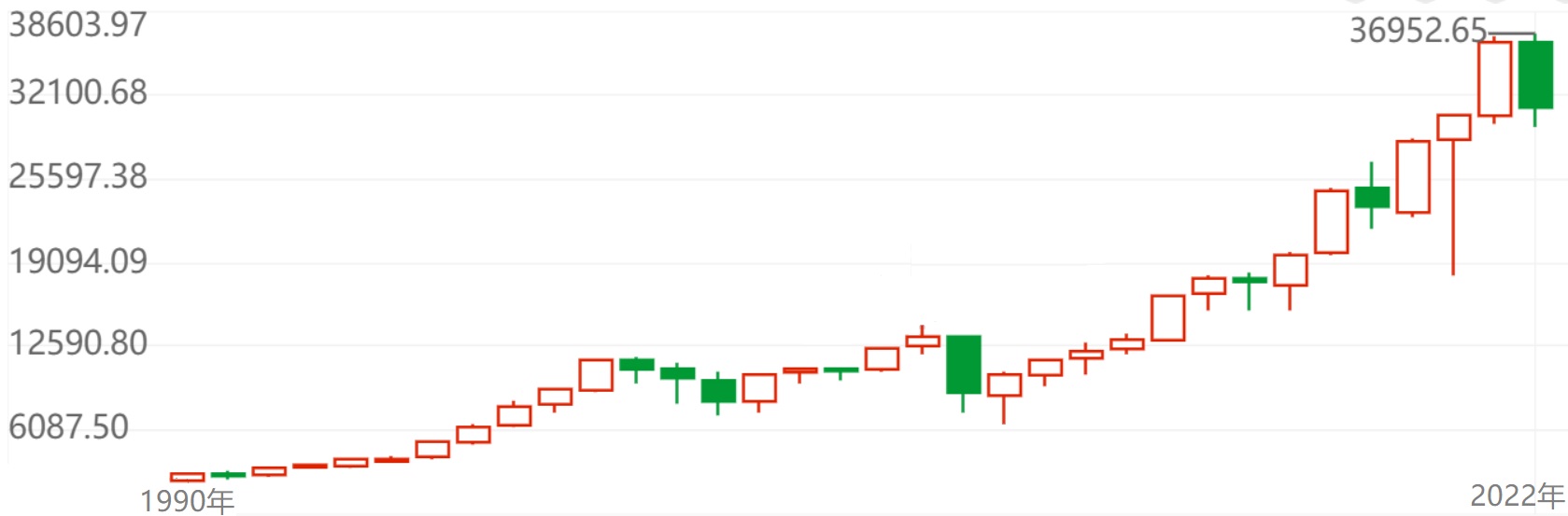 【2、A股的本质是周期】如果只能用一个词来描述A股和欧美股市的主要区别,我想这个词可能是“周期”。以道琼斯指数为例,它的年K线是这样的: 道指一路上涨,气势如虹,从1990年的2750点涨到2022年的36952点,32年涨了13.4倍,年化收益8.5%。而上证指数的年K线是这样的: 上证指数从1990年的100点到2022年的2863点,32年涨了28.6倍,年化收益11%。比较中美股市,有一...