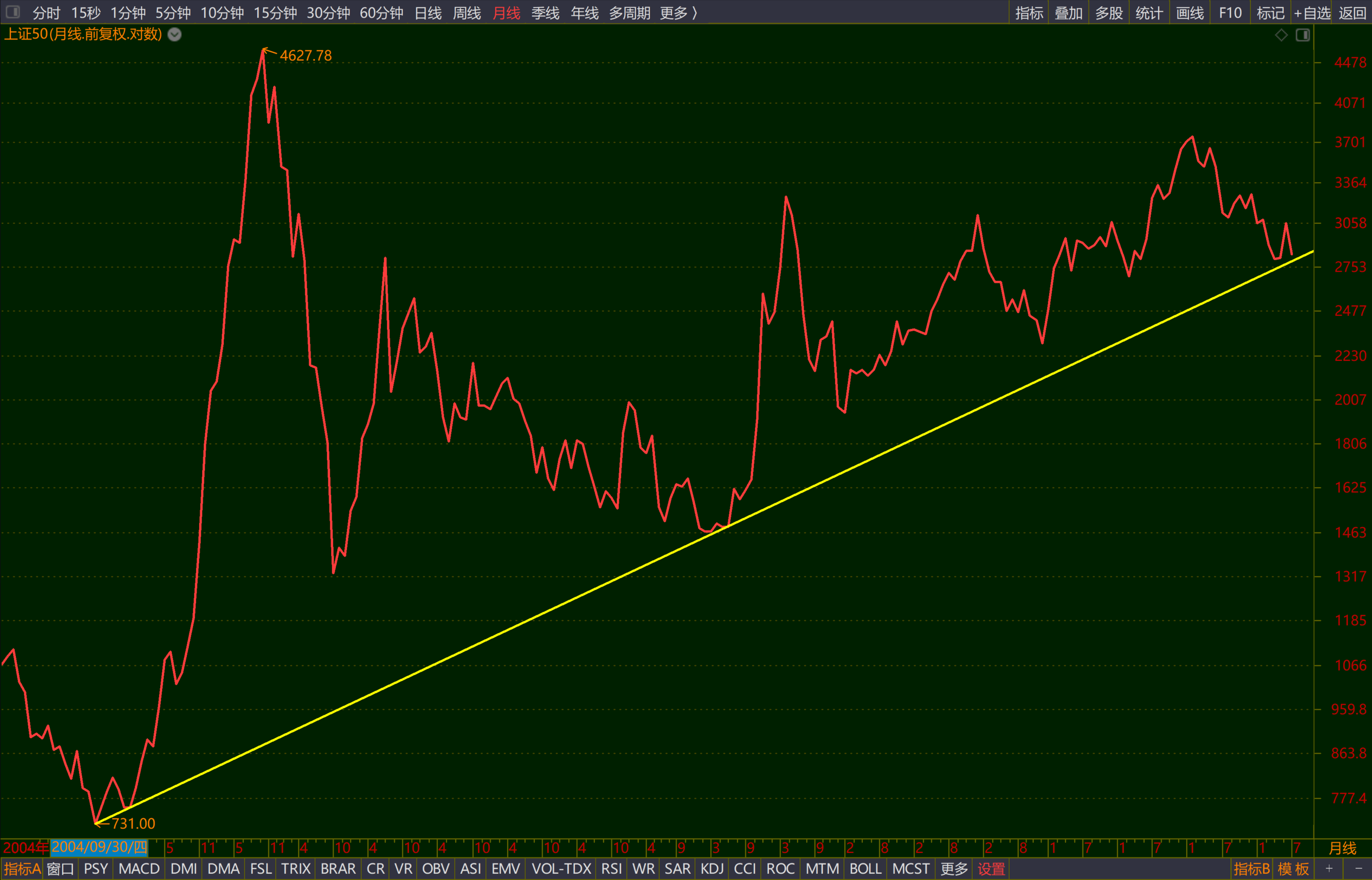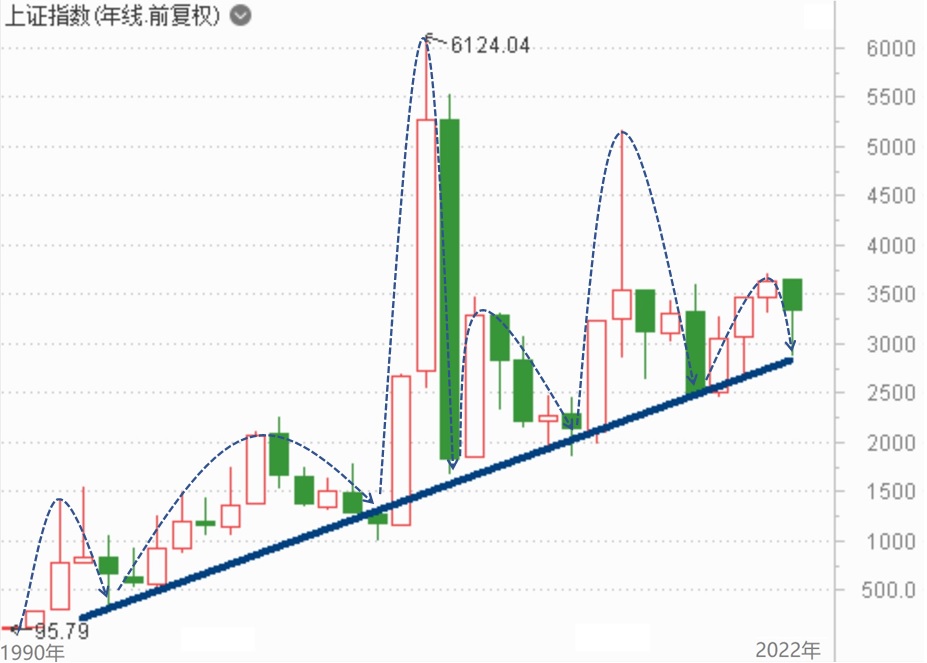 1、 底线逐年抬升。把A股历年的历史大底连起来画一条线,是一条每年抬高100个点左右的上升线,这就是A股的底线。