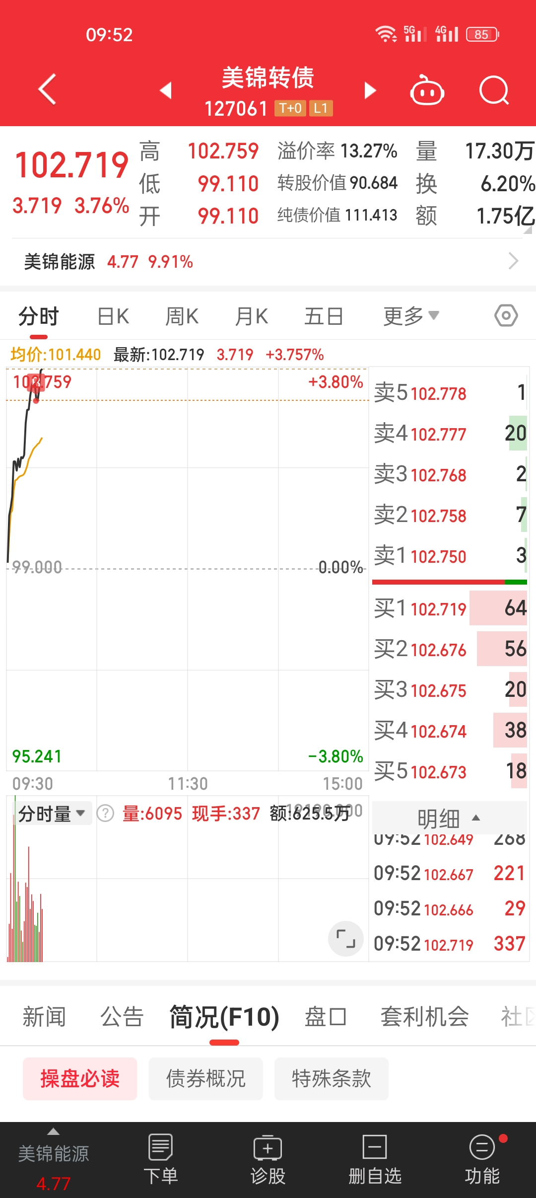 找到一个我有信仰的转债。他不一定比万凯好。毕竟万凯的合理价格在115,会有一种无形的力量把他拉到115。但他比万凯上限高,要是1个月内热点板块炒完了,就轮到他表演了,他有不小的概率会以火箭飙升的速度到200。