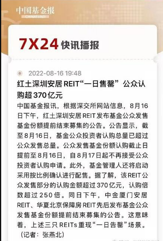 截至19:00时许,从渠道处得到的消息显示,三只产品均卖爆。其中,华夏北京保障房REIT募集超过190亿元,中金厦门安居REIT募集规模超100亿,红土深圳安居REIT的募集规模也超过了50亿元。