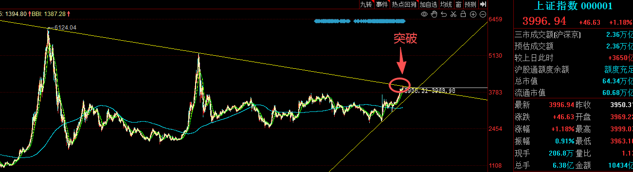 今天是具有战略意义的一天,上证指数突破了长期下降趋势线。