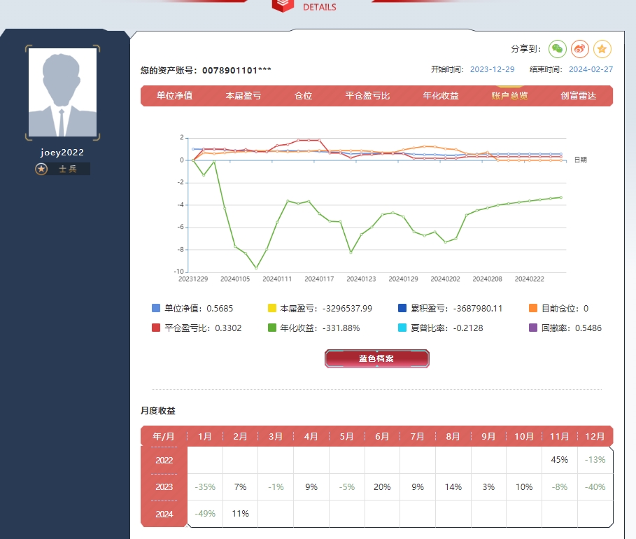 你这图左边曲线不显示净值啊7禾是从7月开始算的,所以23年的只能看长期曲线,估计23年净值1.8左右,但是我多余资金都在外面,所以风险度看着高,顺风的时候老出金造成显示净值高。也准备用一下更好的统计软件了。