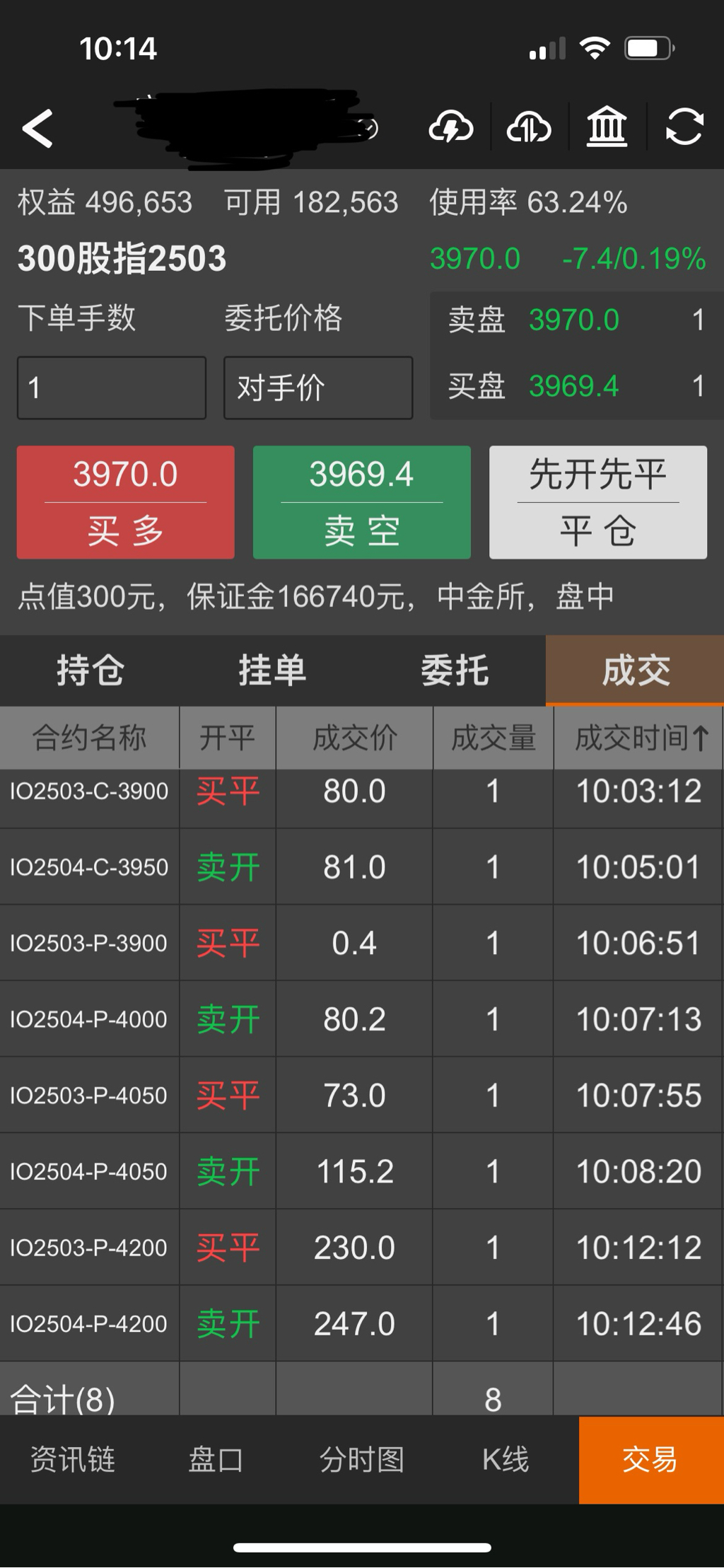 资金管理:在风云诡谲的资本市场,最重要的事情是生存。保证账户的安全,首先要有反脆弱的资金管理方案。为什么9债1购值得借鉴,这个就是杠铃法则的应用,大部分资金放在债券和固定收益品种中,小部分资金冒高风险博取高收益。实盘IO账户3张卖沽已经相当于接近100万的仓位,对应的必须要有现金支撑,否则杠杆就太高了。再强调一次,卖沽替代的是现货ETF仓位,没有保护的裸卖沽是风险很大的。而在期货和期权市场中,永远不要满仓梭哈,保留足够的现金应对极端行情是非常重要的。