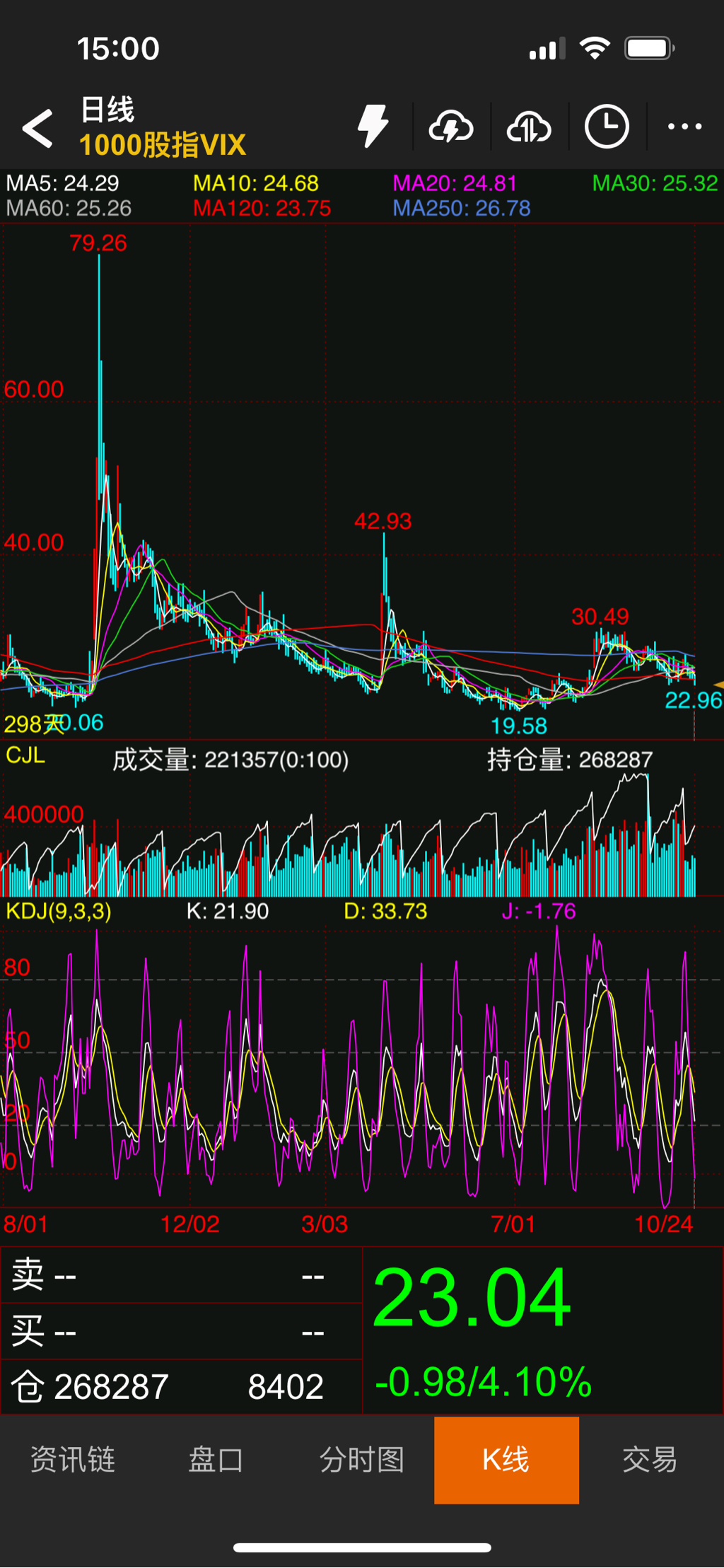 MO要不要开反向比例价差:MO隐波虽然走低,但是还不够低,另外1000均线交错。今天上证指数上破创新高,1000的走势也好起来了,我暂时不认为这里有加速下跌的迹象,升波也没有。目前MO我是偏多双卖持仓,买沽可以加到1:1,但是更高的比例大概可以等一等,除非你认为短期会有加速的回调。我认为现阶段持有铁鹰式是合适的,1000仍是一个区间震荡,比例买沽并不需要同时开仓,可以等铁鹰式赚钱了之后再择时判...老师:图中的成交量,持仓量是什么意思,VIX没有交易品种吧,谢谢